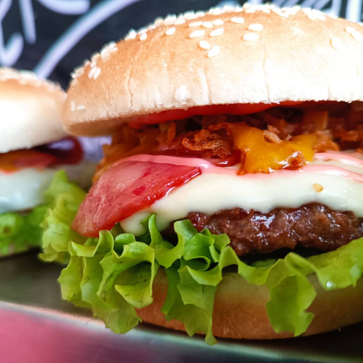 Pan de hamburguesa, carne artesanal, tocineta, triple queso tipo mozzarella, cebolla, lechuga, tomate crujiente y salsa de la casa.