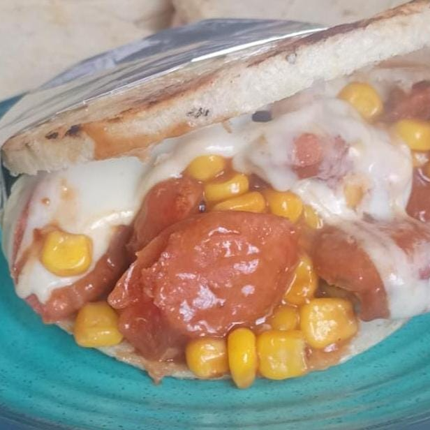 Chorizo picante con salsa BBQ, maíz y queso.