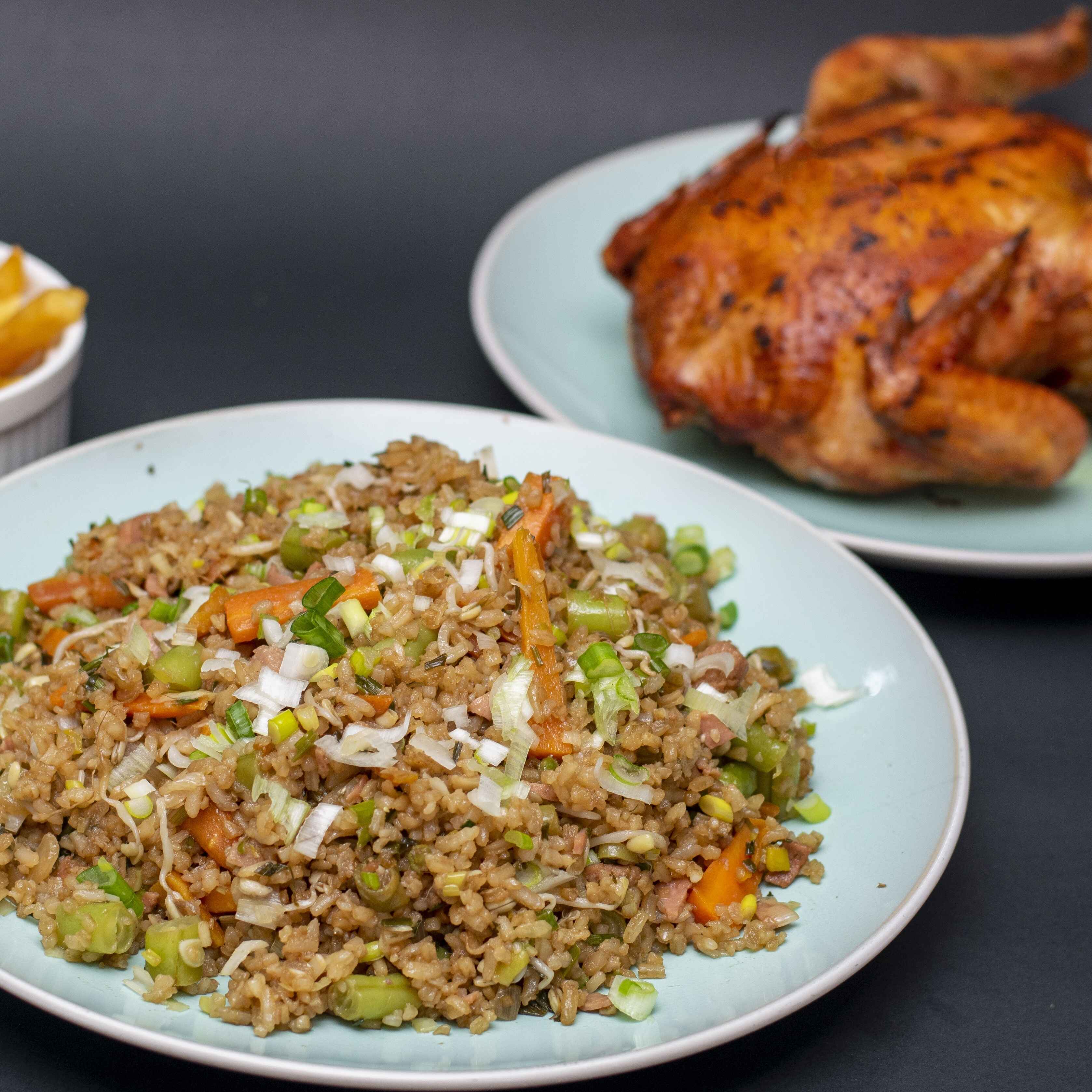 Arroz oriental,mix de tocineta, jamón ahumado, raíces chinas, cebollín más papa francesa, más ocho presas de pollo.