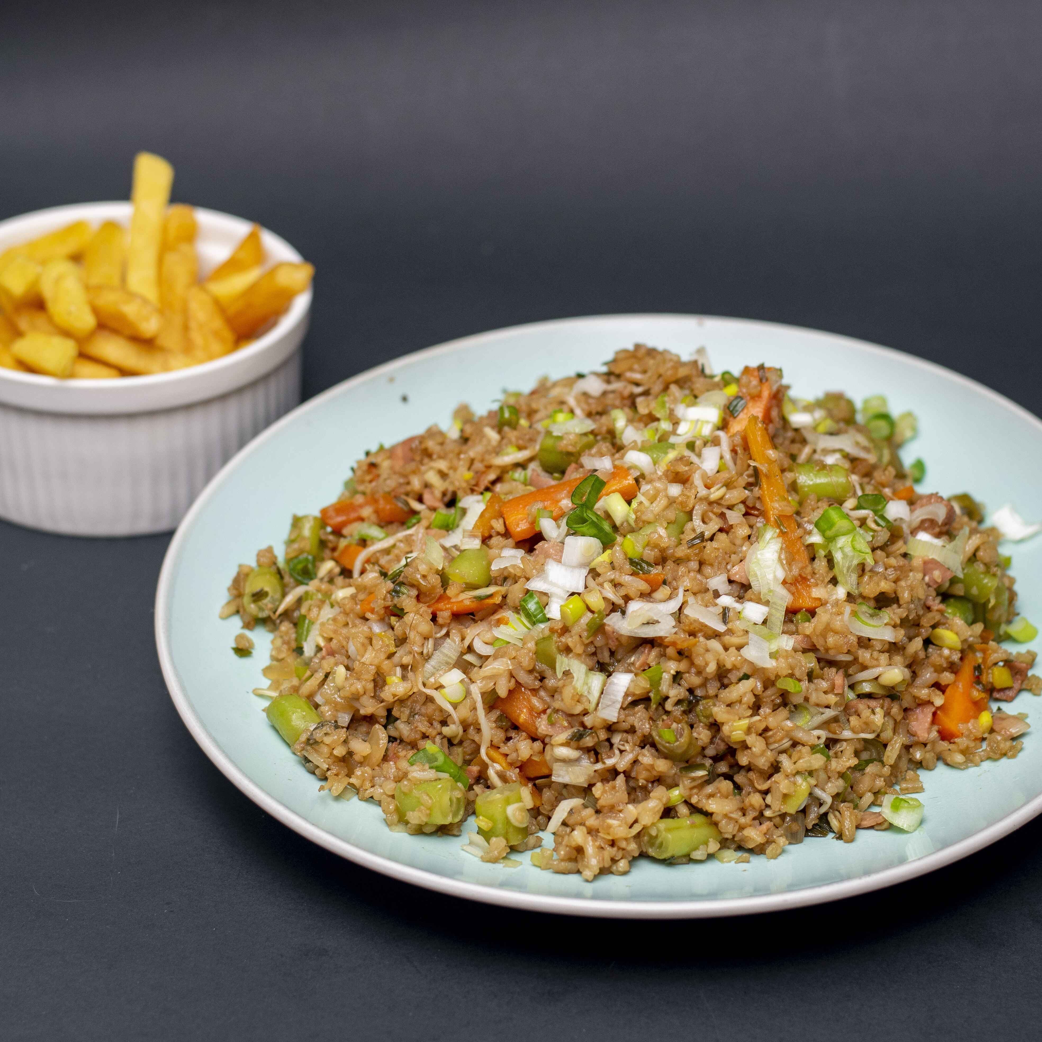Arroz chino grande, mix de tocineta, jamón ahumado, raíces chinas, cebollín, más papa francesa.