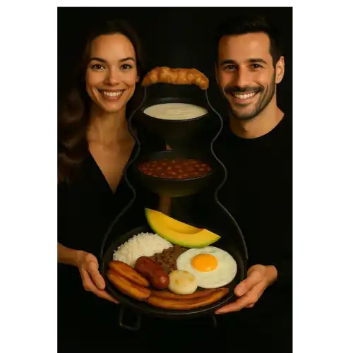 Arroz, chorizo, morcilla, carne molida, huevo, arepa, aguacate, tajada de plátano, frijoles, acompañamiento de mazamorra y chicharrón especial.