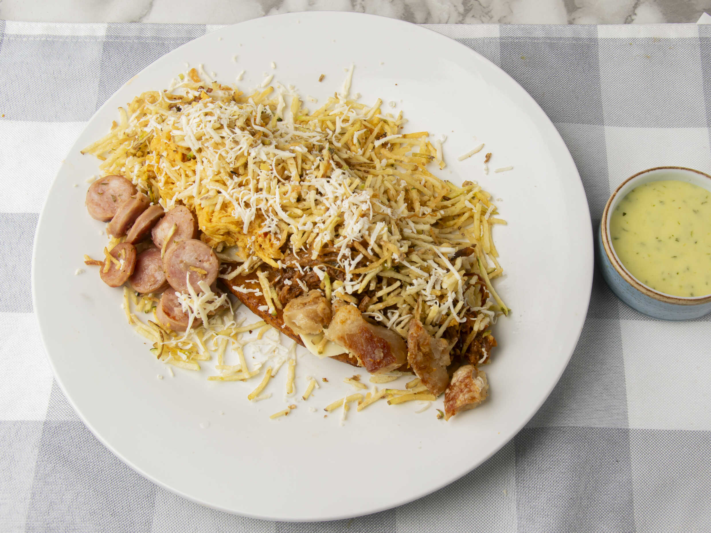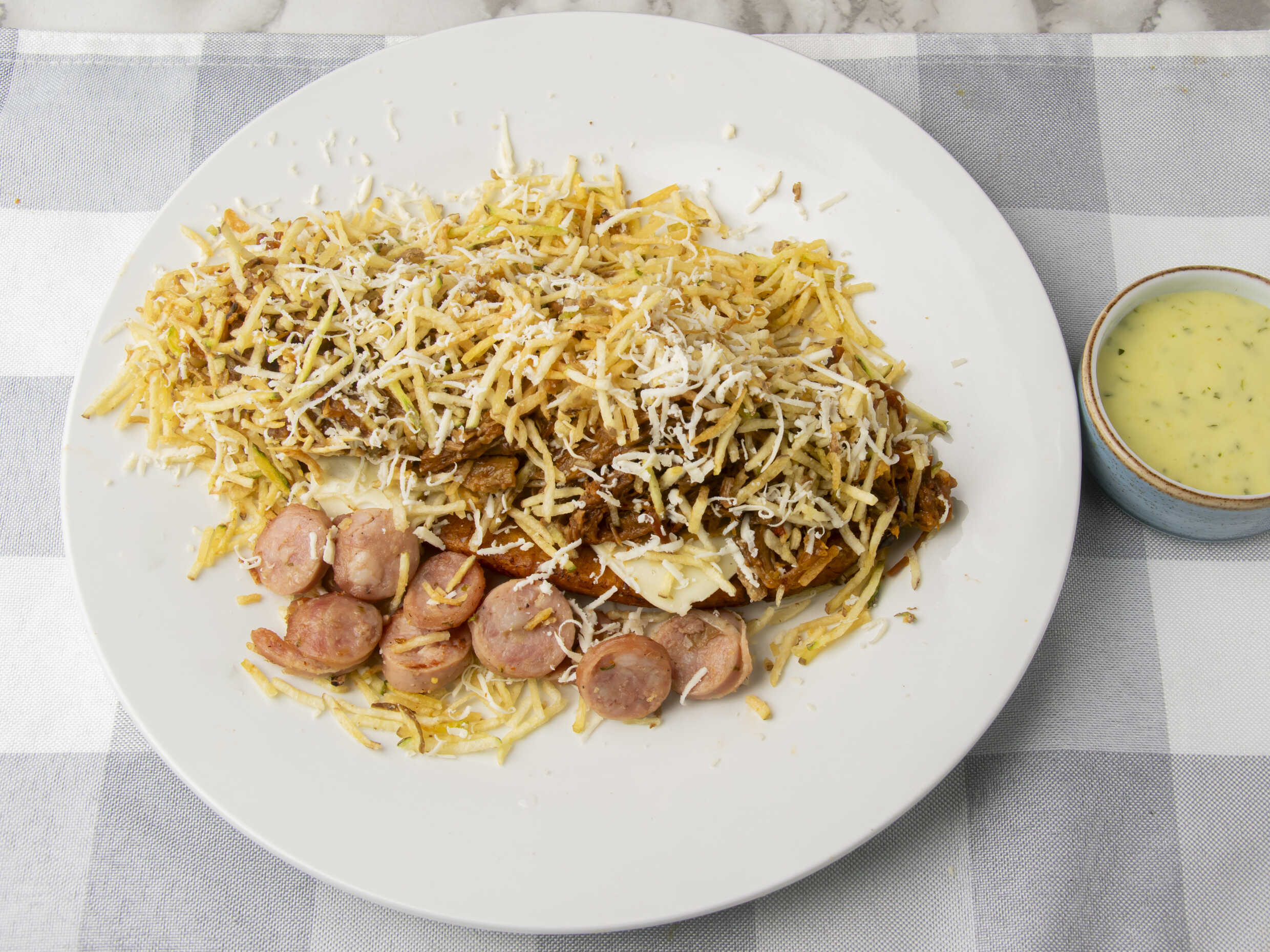 (carne desmechada, trocitos de chorizo, queso mozarela, quedó costeño, papa fósforo)