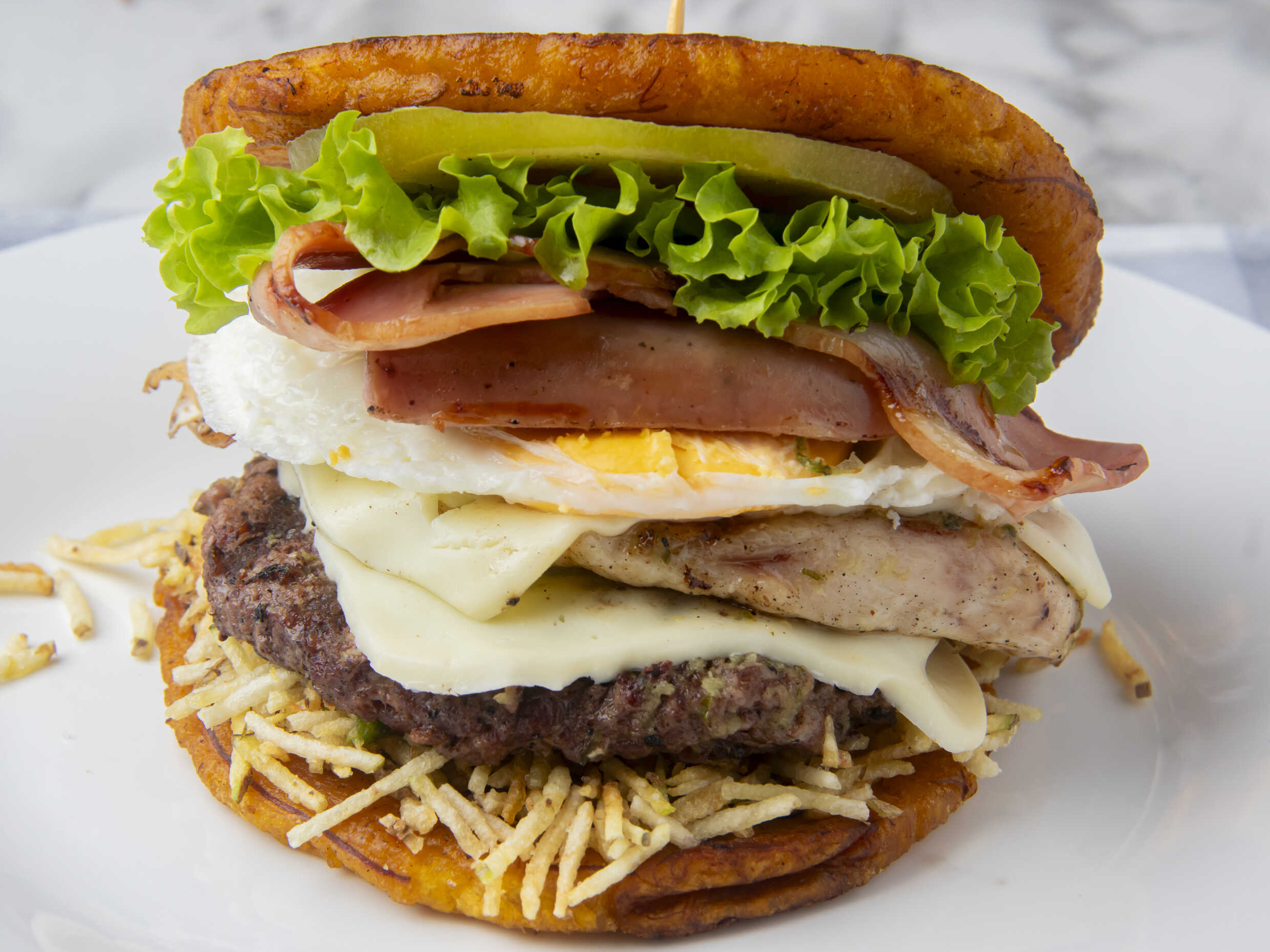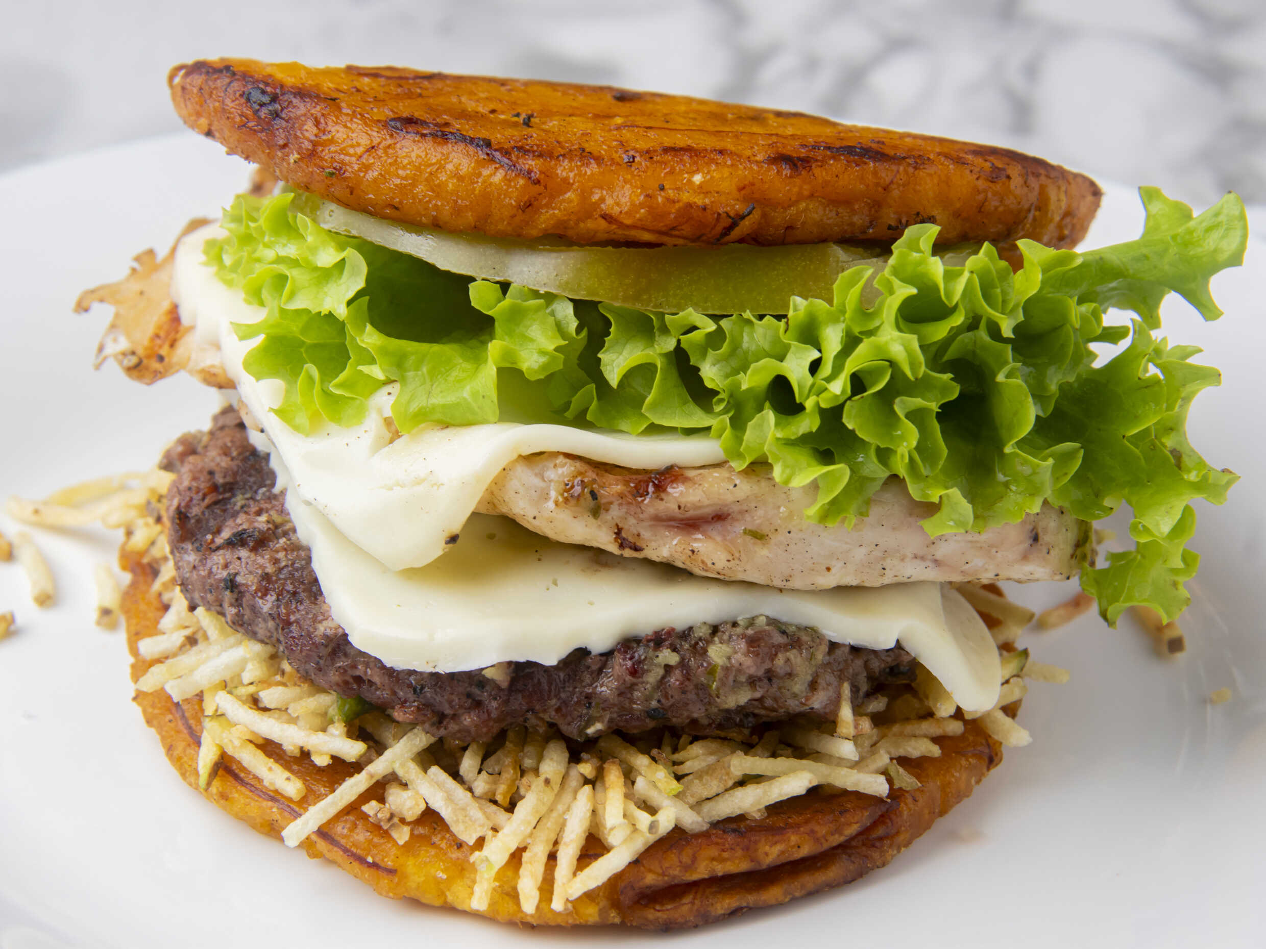 (Doble capa de patacón, 1/4 de libra de carne de res, 1/4 de pechuga de pollo, lechuga, tomate, cebolla, queso mozarela, papa fósforo)