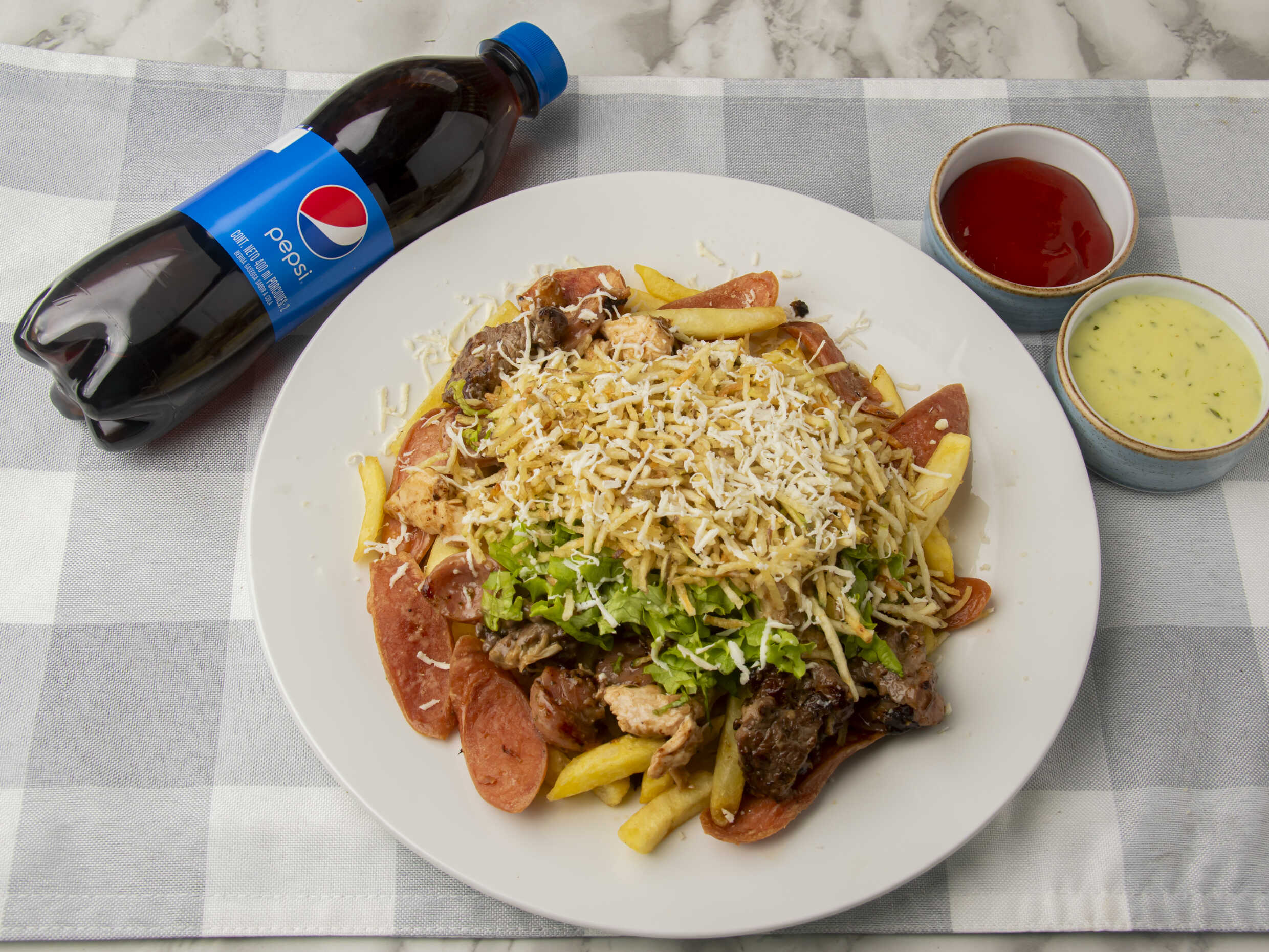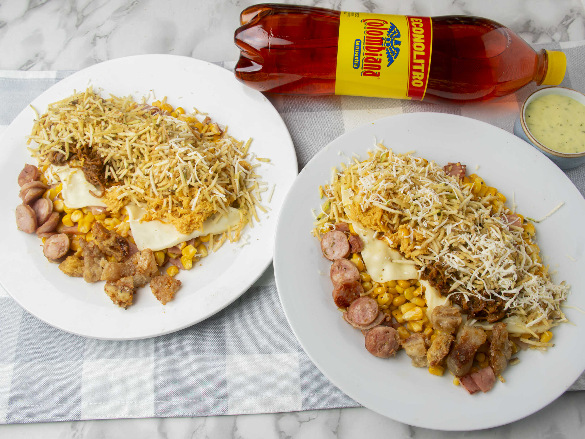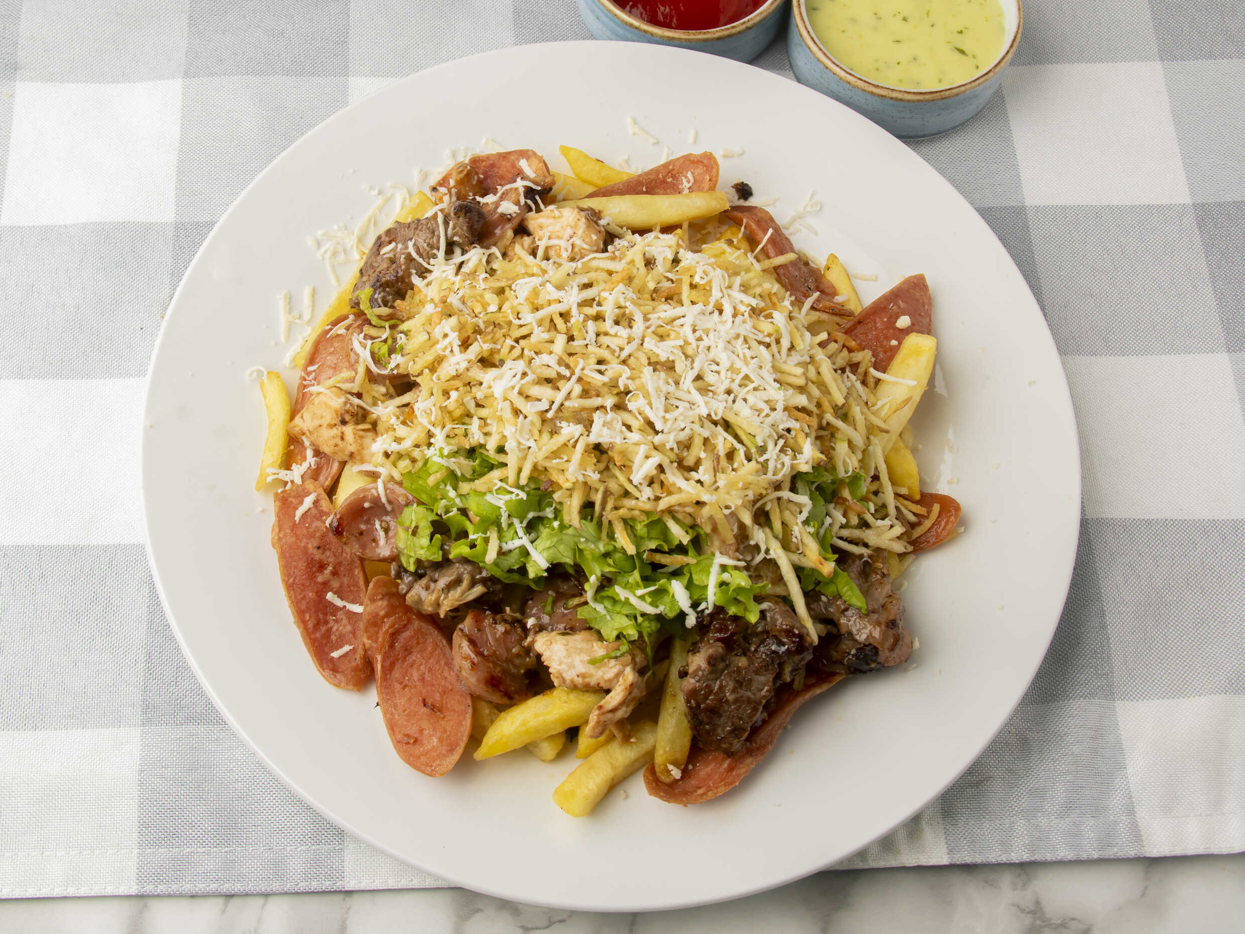 Cubos de pollo lomo de res chorizo papa francesa, salchicha americana, queso costeño, queso mozarela, papa fosforo, tártara de la casa