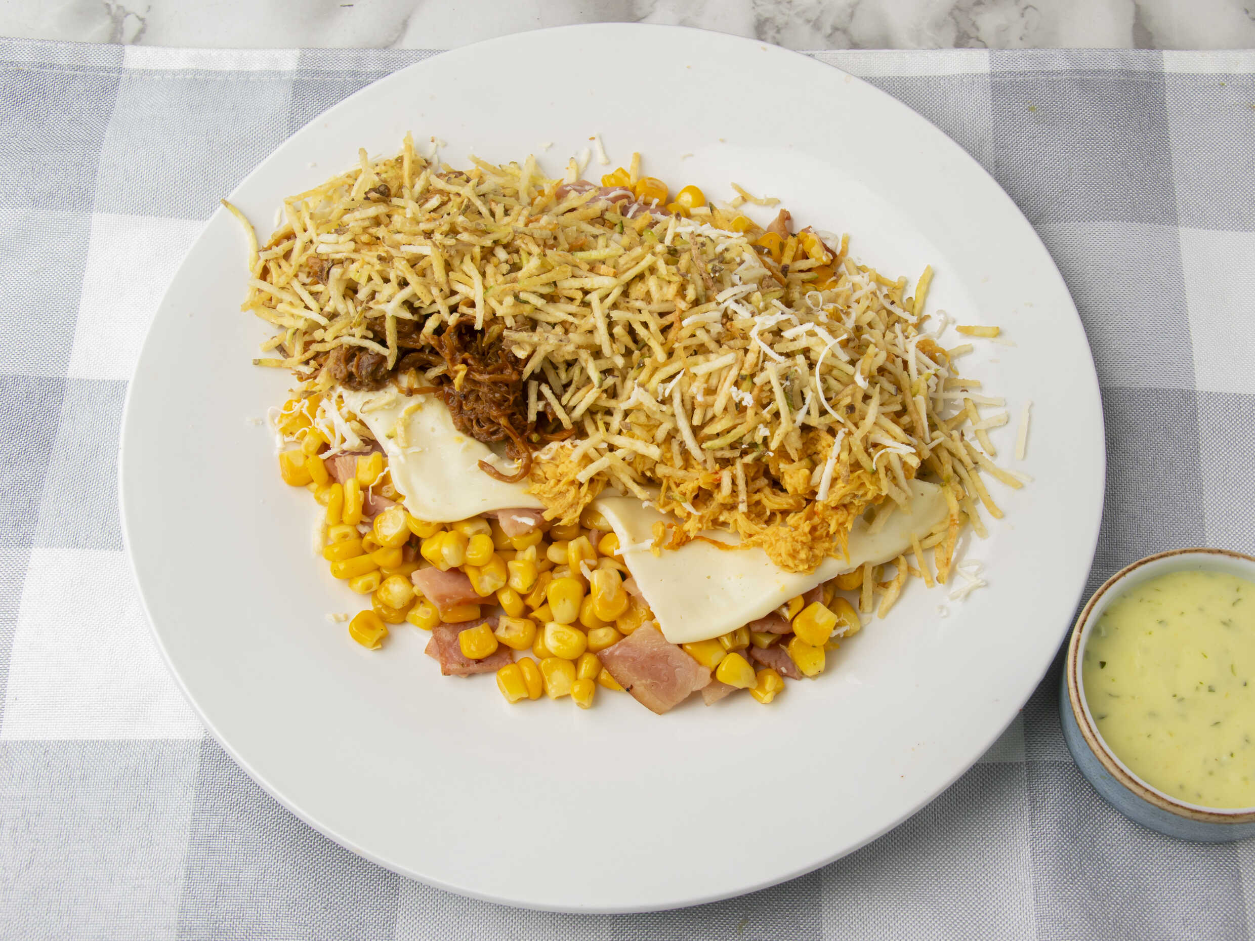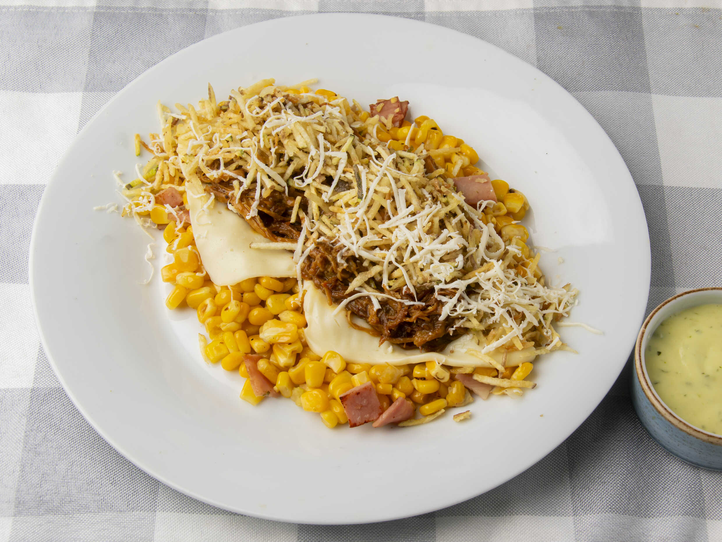 Maiz tierno, tocineta, pollo desmechado, queso mozzarella, queso costeño y papa fosforo.