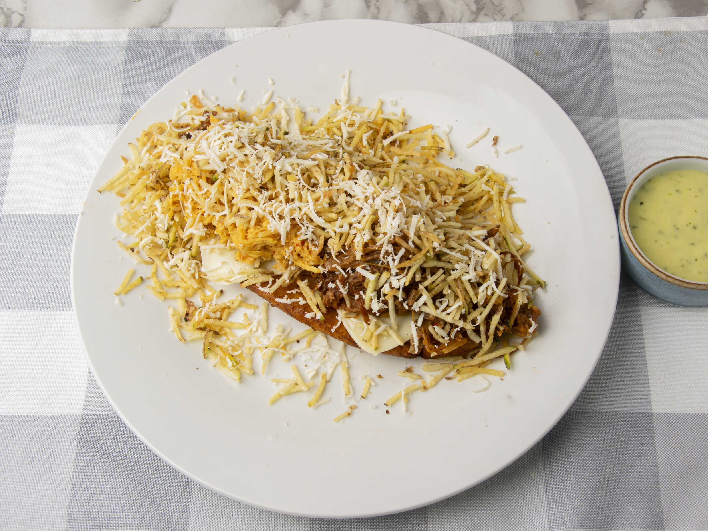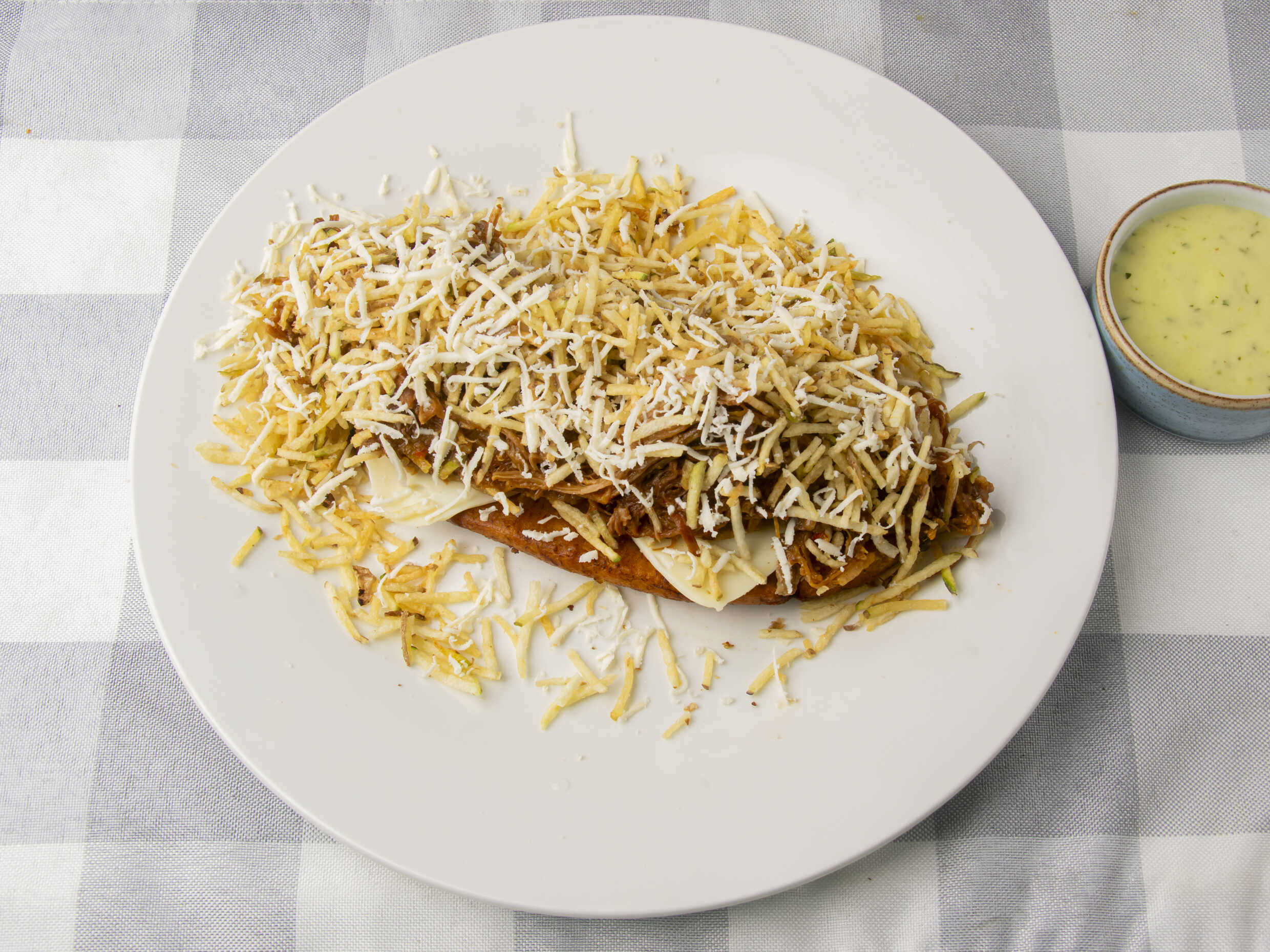 Carne desmechada, queso mozzarella, queso costeño, papa fosforo.