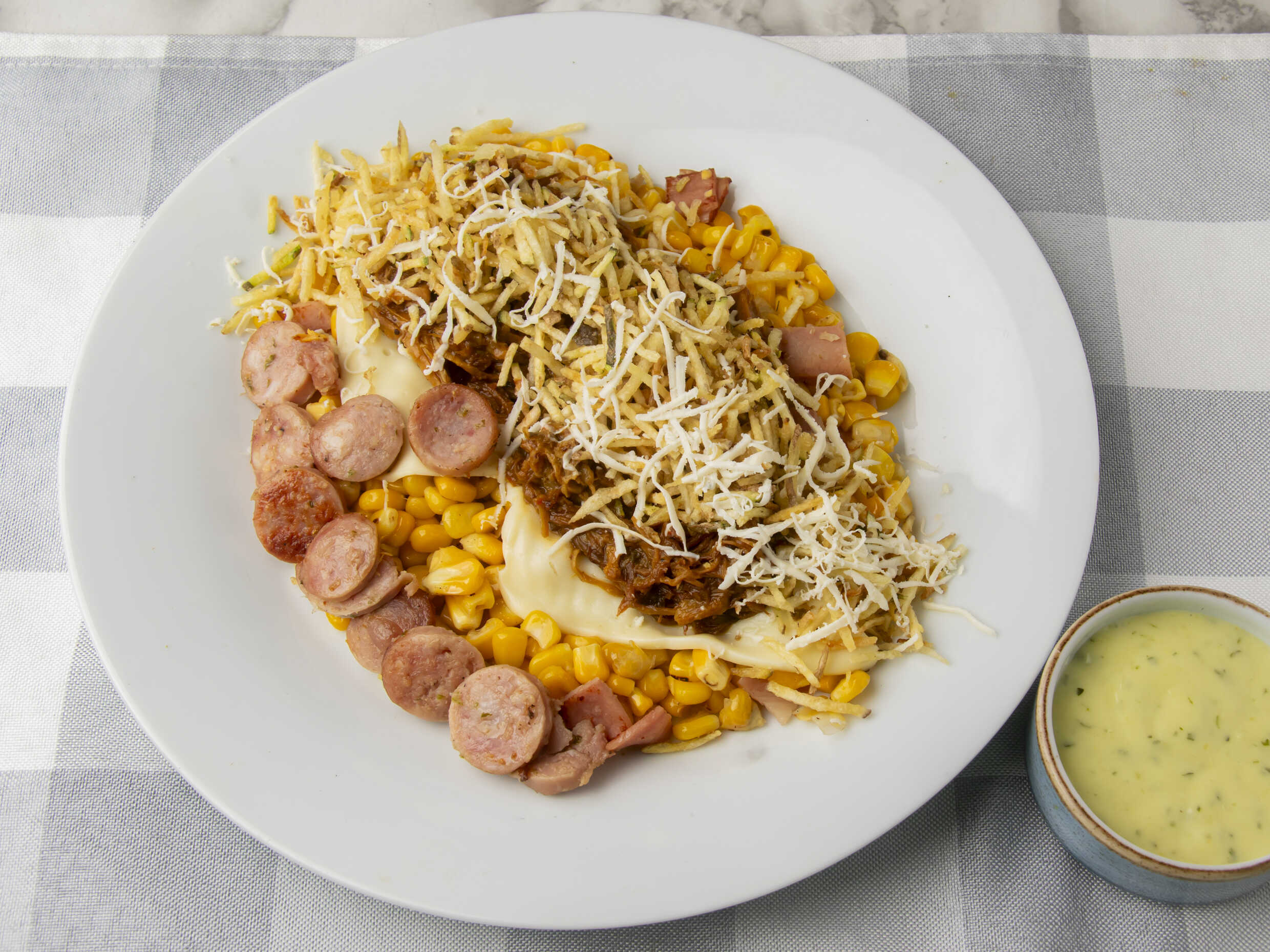 (Maíz tierno, tocineta, carne desmechada, trocitos de chorizo, queso mozarela, quedó costeño, papa fósforo)