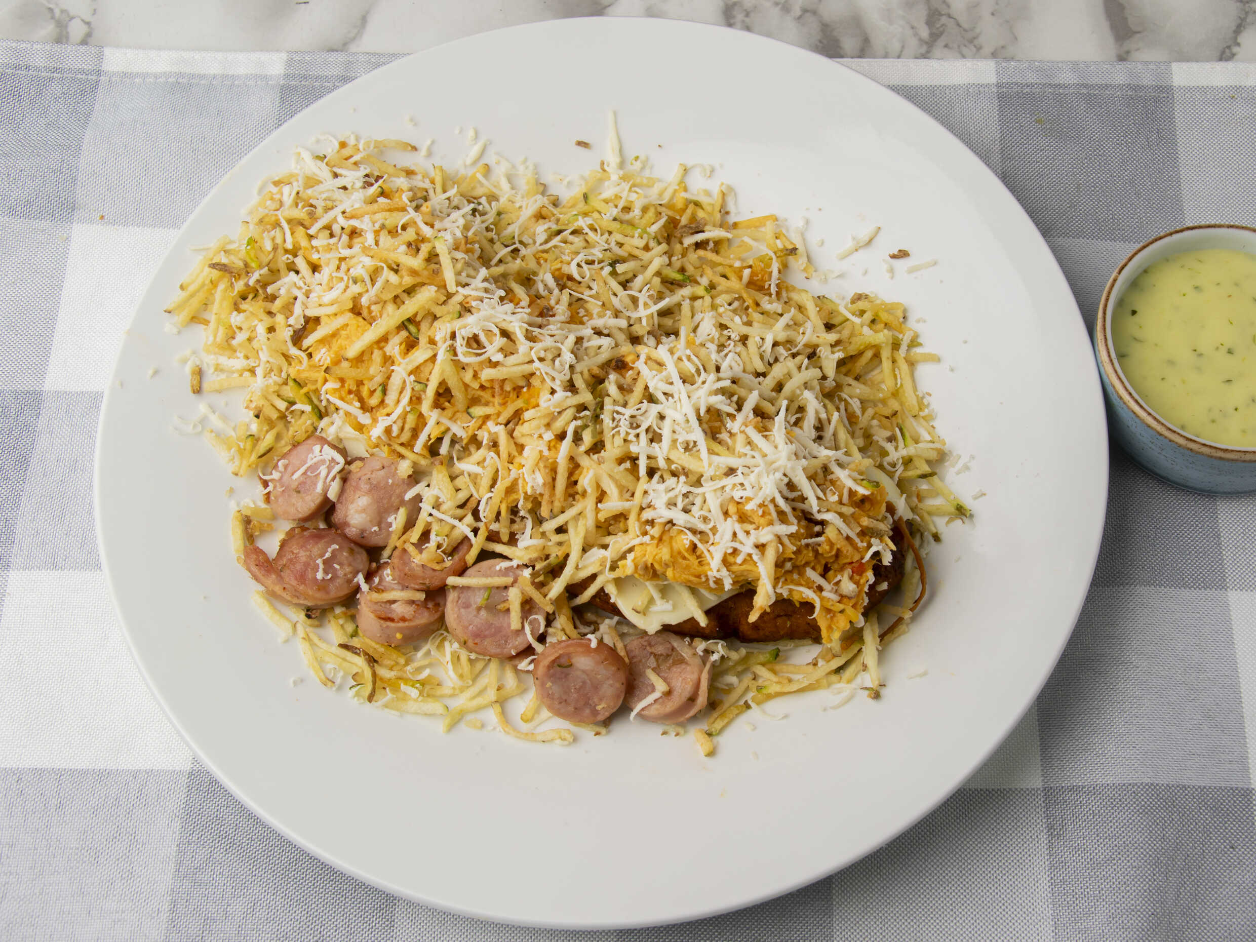 Cubos de pollo, papa francesa, salchicha americana, queso costeño, queso mozarela, papa fosforo, tártara de la casa