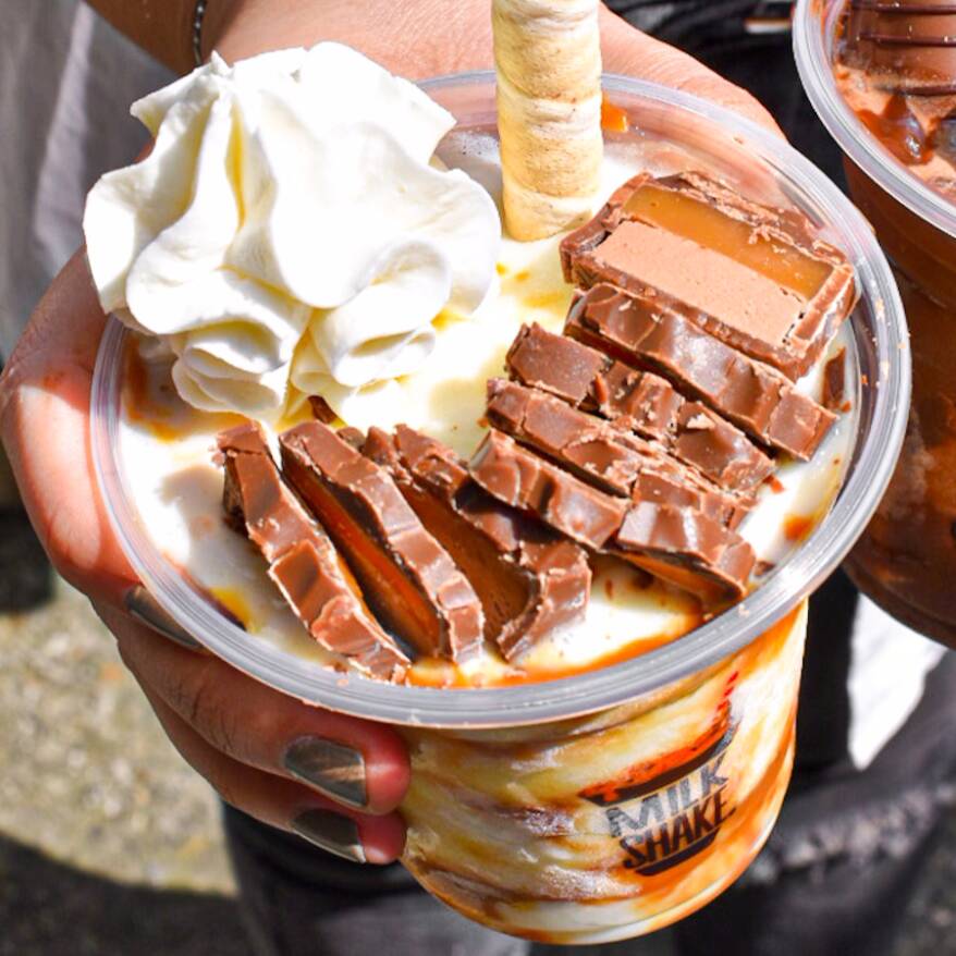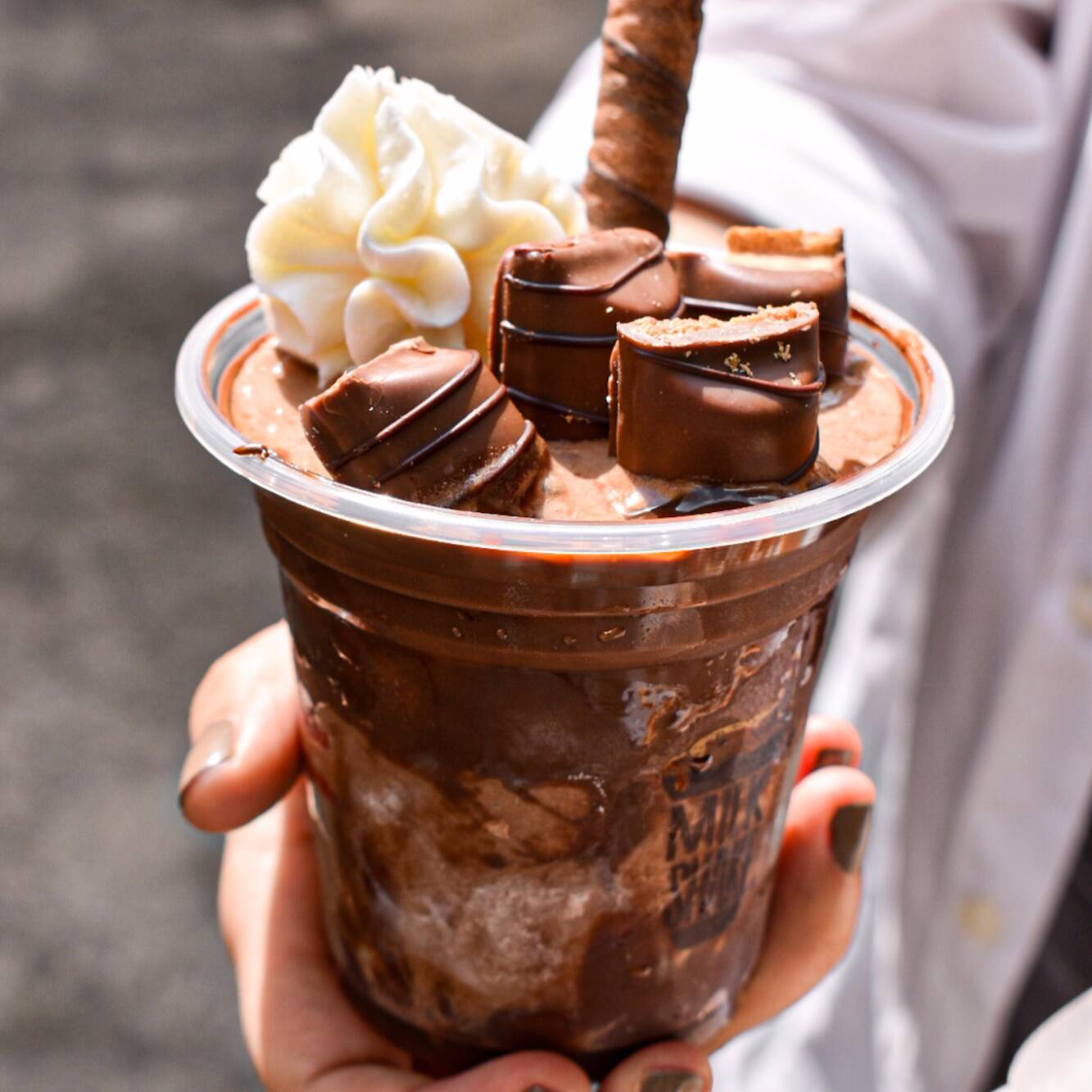 Malteada de brownie, crema de avellanas, m&m chocolate, deditos Nestlé, Chokis bolitas, grageas de colores, barquillo, jeringa de chocolate, salsa de chocolate, chantillí.