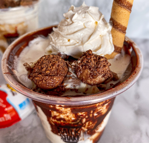 Malteada de chocolate, Kinder Bueno, crema de avellanas, barquillo, salsa de chocolate, chantillí.