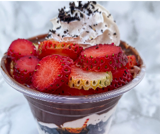 Malteada de fresa, crema de avellanas, Sparkies, masmelos mini, moritas, barquillo, salsa de fresa, chantillí.