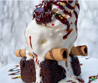 Un delicioso brownie de chocolate acompañado con el helado que elijas, crema chantilly, chips de colores y salsa de chocolate.