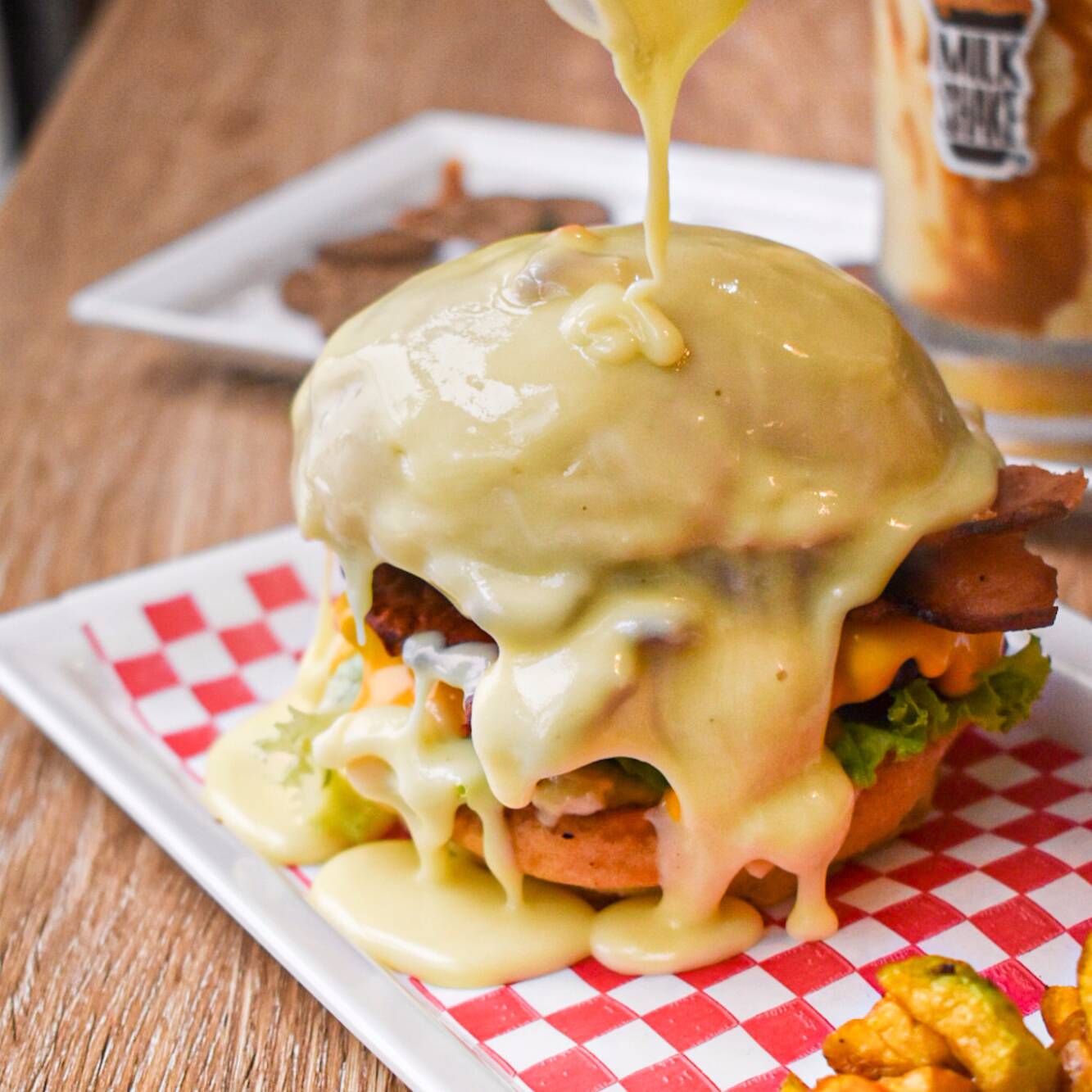 Pan de papa, 150 g de carne artesanal, bañada en queso, lechuga, tomate, cebolla, queso cheddar, tocineta y salsa de la casa.