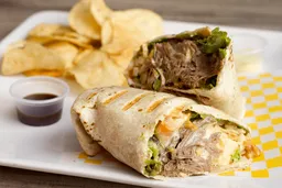 Tortilla , pollo desmechado, papa ripio, doble queso mozzarella, verduras frescas.