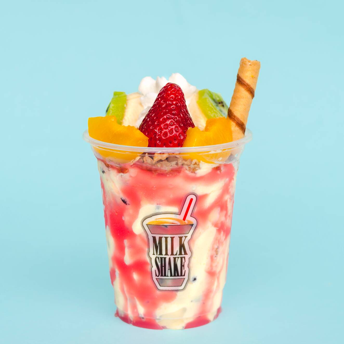 Malteada de maracuyá, granola, fresas, kiwi, durazno, banano, mermelada de mora, barquillo, chantilly.