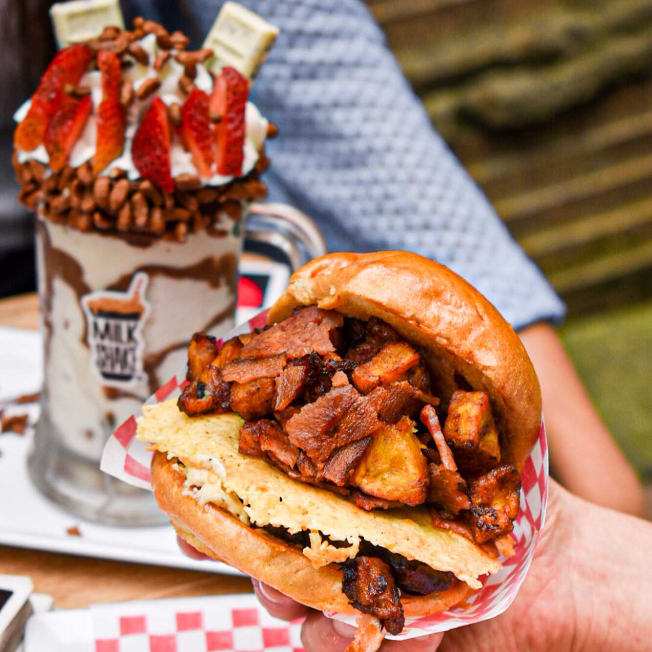 Tortilla o waffle a elección, carne tocineta, papa ripio, doble queso mozzarella, verduras frescas.