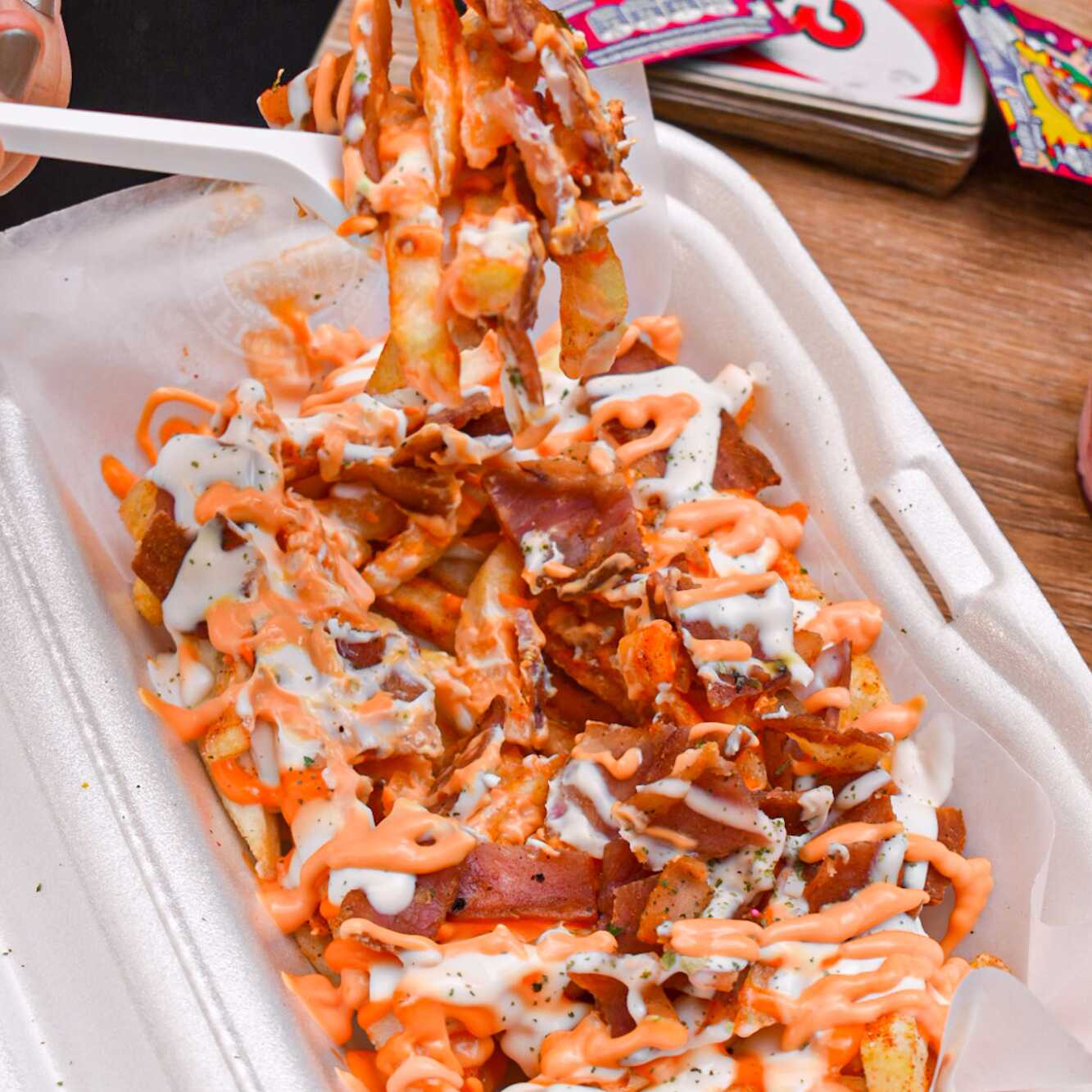 350 g De papa, salchicha americana, tocineta carnuda, baño de queso cheddar y salsa ranch.