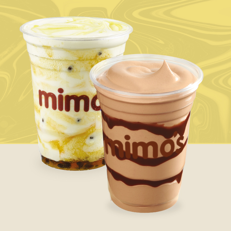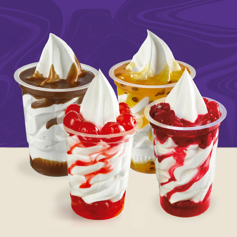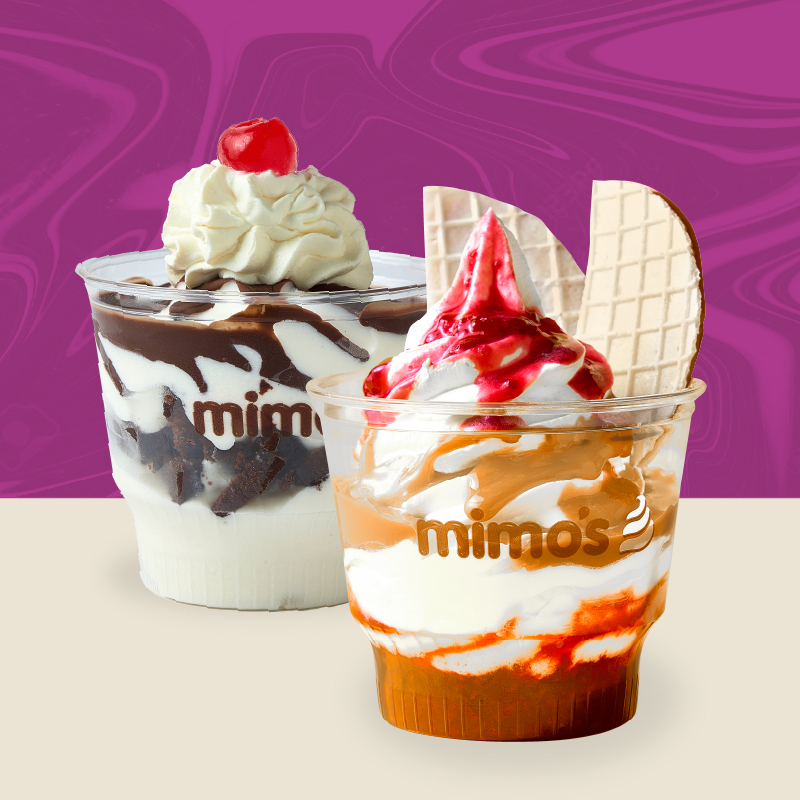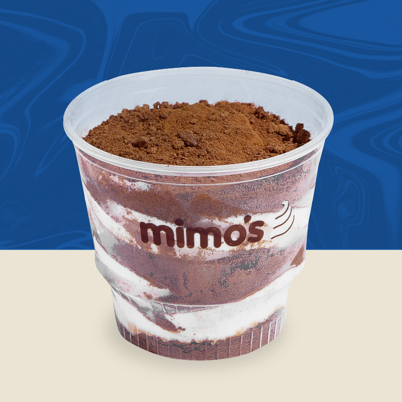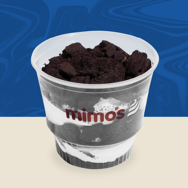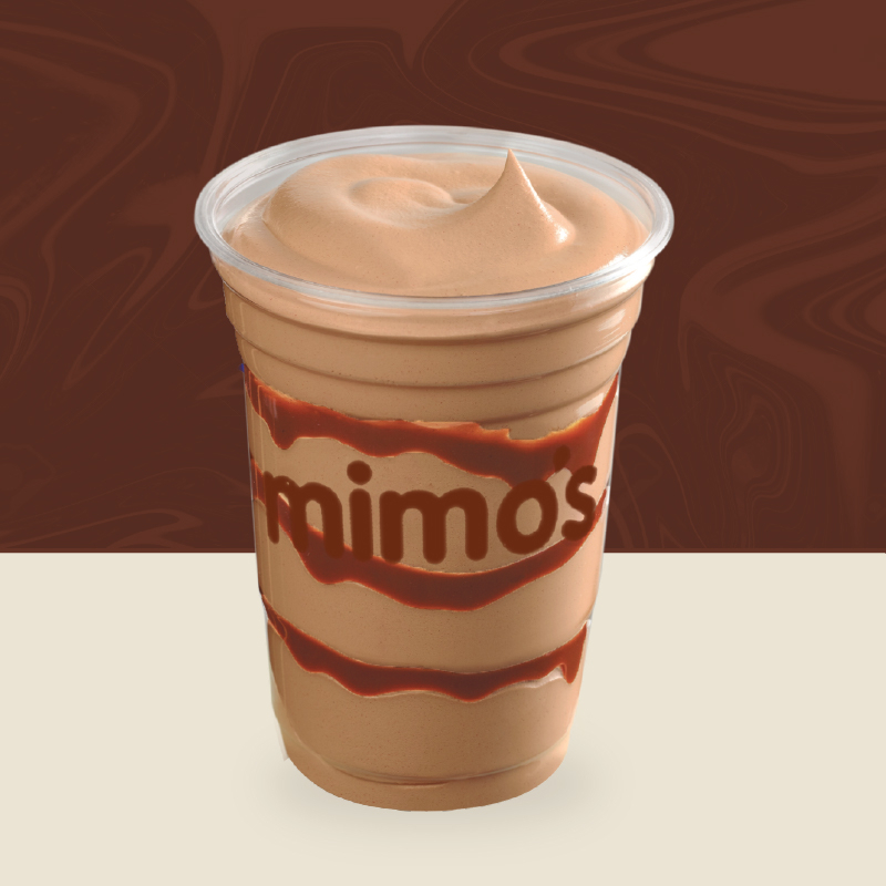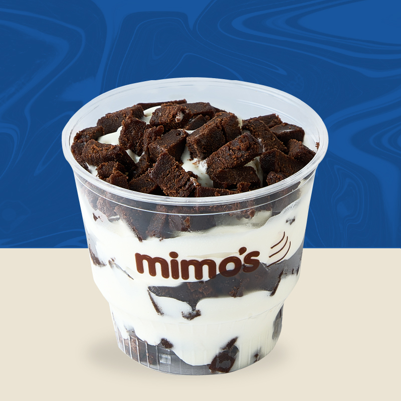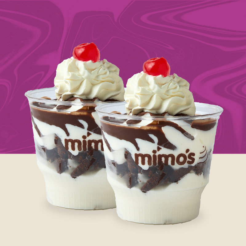 Helado suave de vainilla, trocitos de brownie, chocolate mimos, chantilly y cereza, la consistencia de la cobertura de chocolate mimo's (caliente) puede variar a temperatura ambiente.