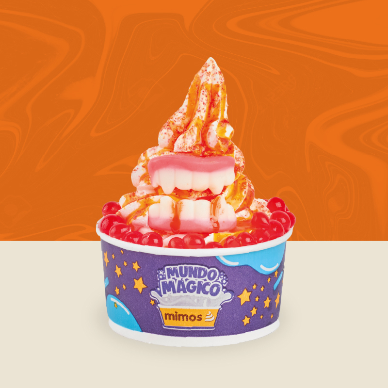 Delicioso helado suave de Vainilla acompanado de explotones sabor a fresa, galleta molida, salsa Halloween y gomas colmillo.