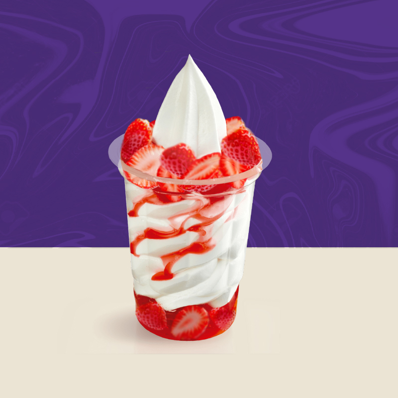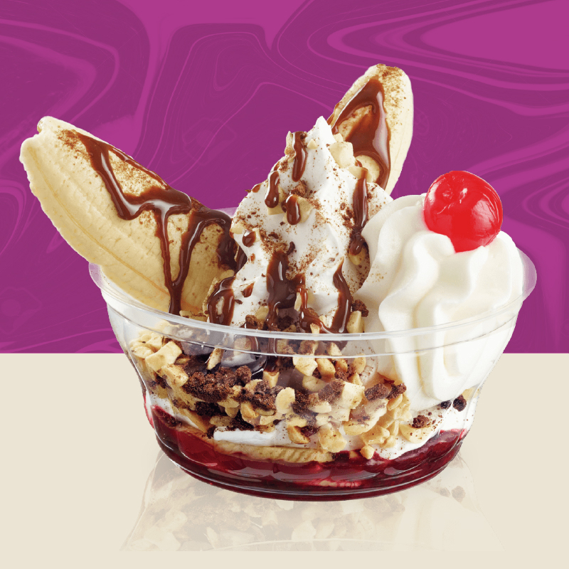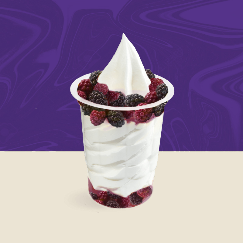 Combinación de helado suave de vainilla, fruta de mora, banano, maní, milo, salsa de chocolate y un delicioso toque de chantilly.