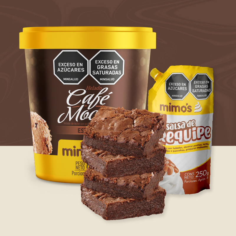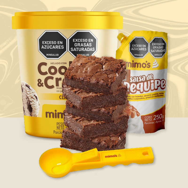 Elige tu litro y salsa favorita, con 5 brownies. Además, lleva una cuchara mimos.