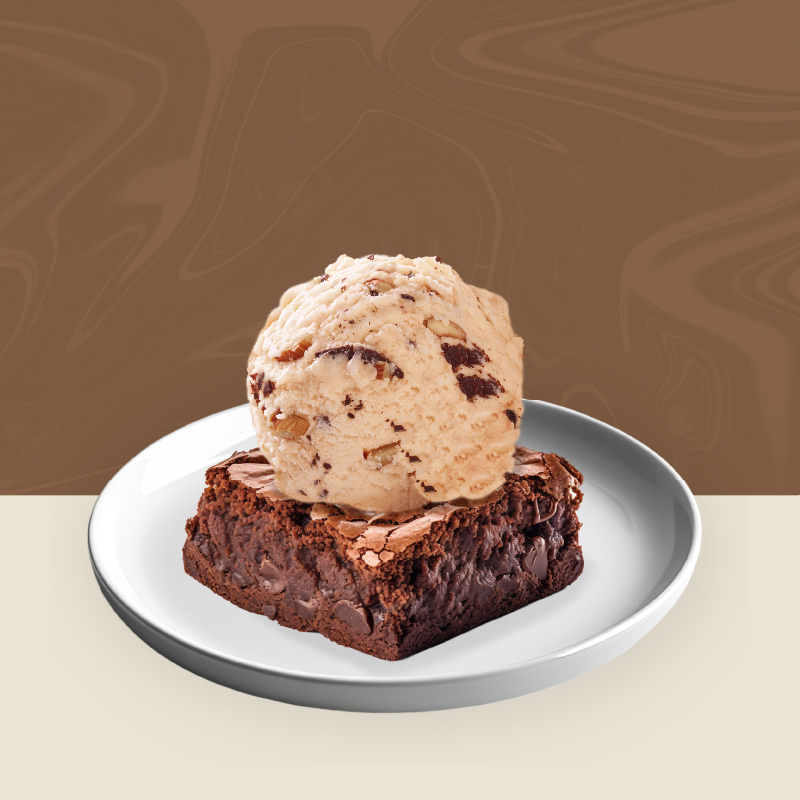 Brownie con helado sabor Yogurt con maní y caramelo salado