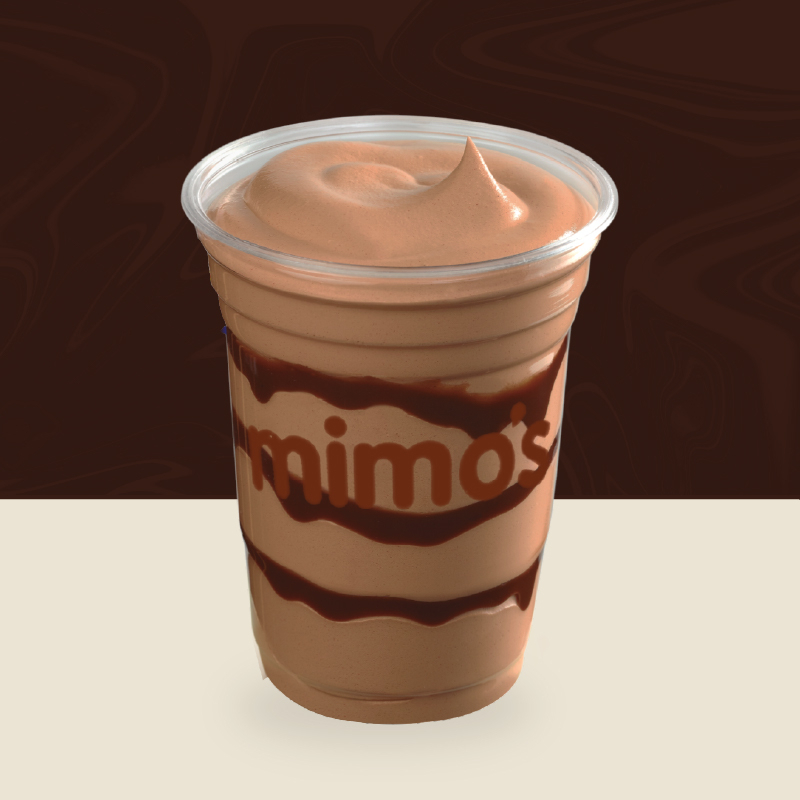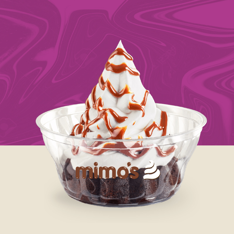 Helado suave de vainilla, trocitos de brownie, chocolate mimos, chantilly y cereza, la consistencia de la cobertura de chocolate mimo's (caliente) puede variar a temperatura ambiente.