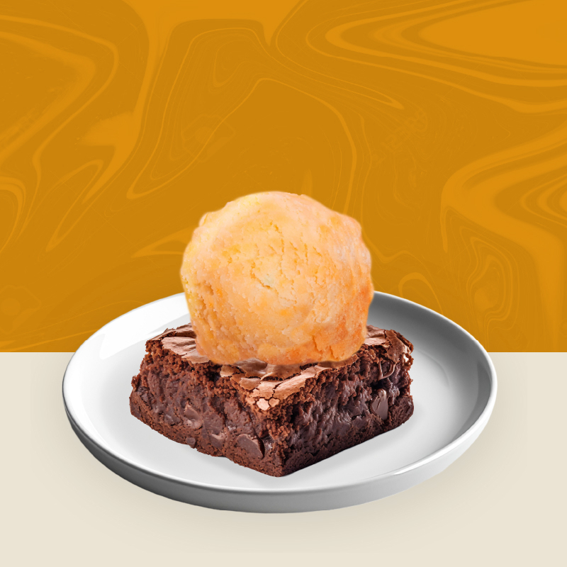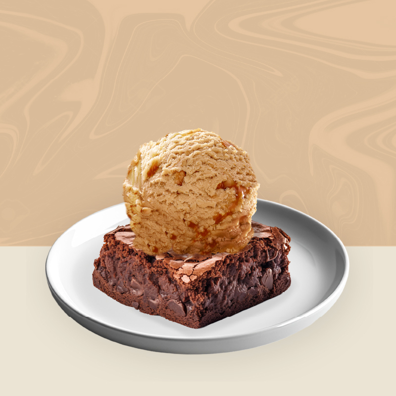 Brownie con helado suave de vainilla y salsa Caramelo, imagen de referencia.