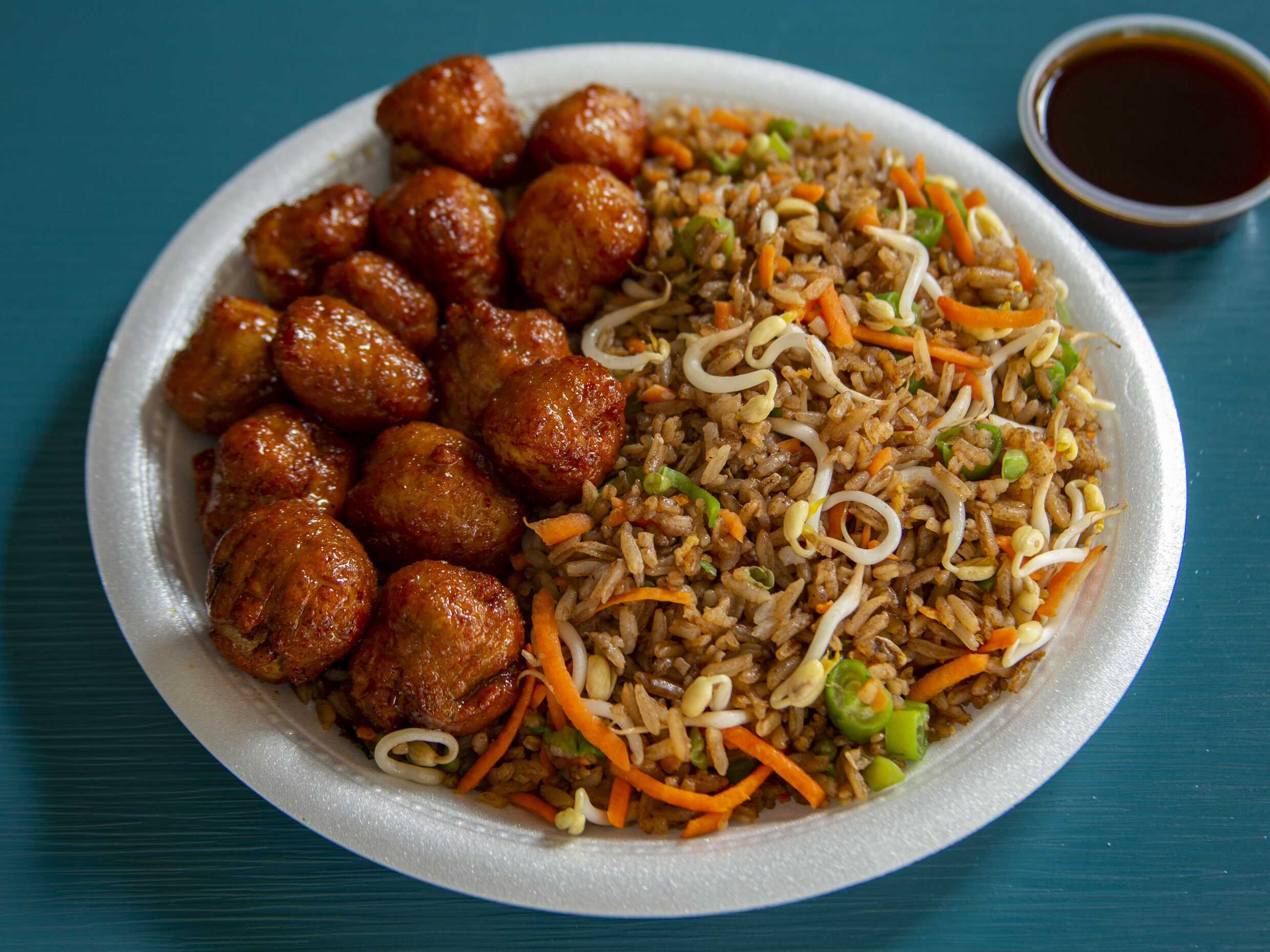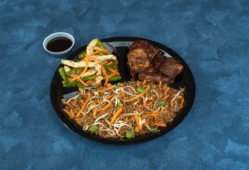 Julianas de carne salteadas en salsa teriyaki, costilla en salsa BBQ y arroz sencillo.