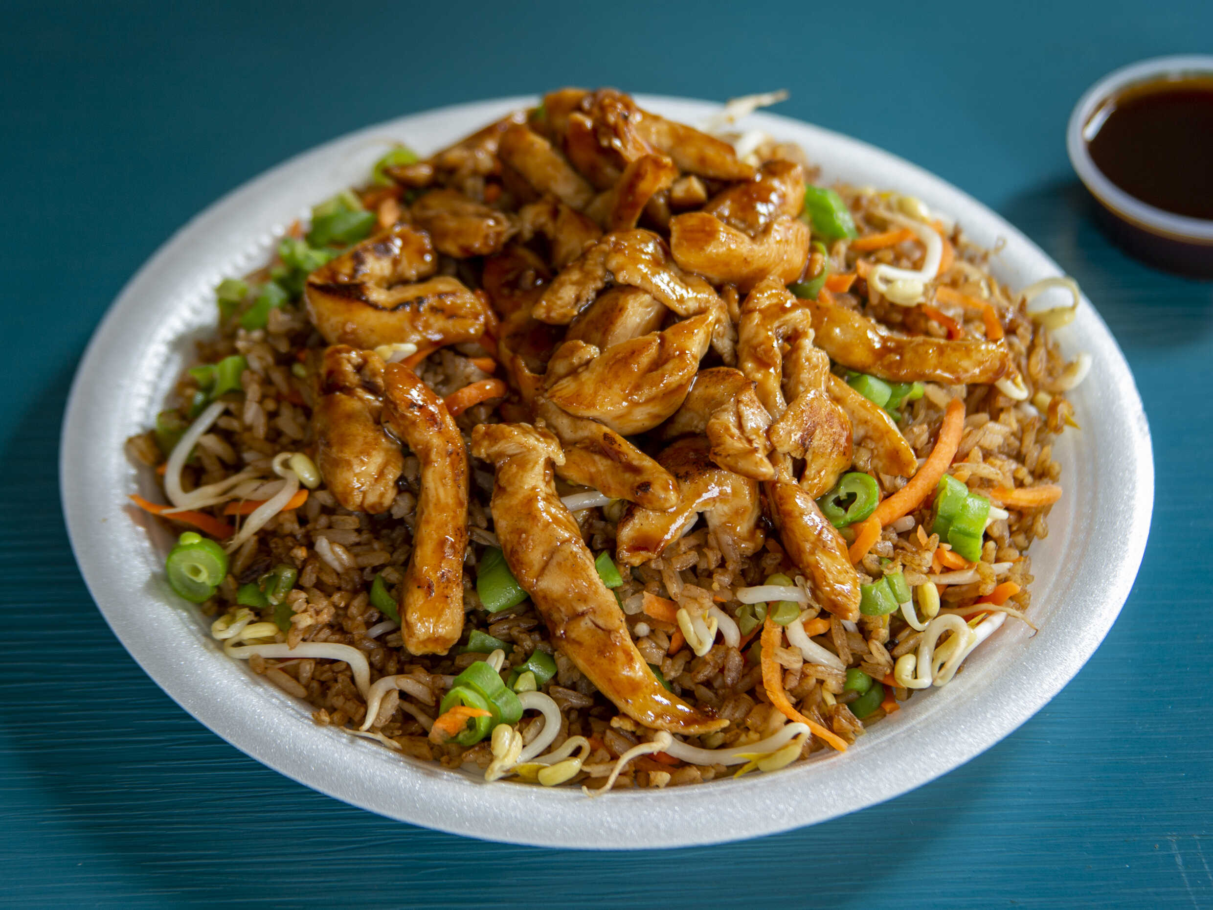 Julianas de pollo salteados en salsa teriyaki, en una base de arroz sencillo.