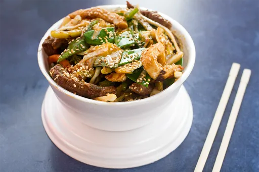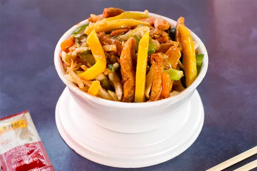 Vegatales con carne, pollo y jamón, salteados en salsa de soya.