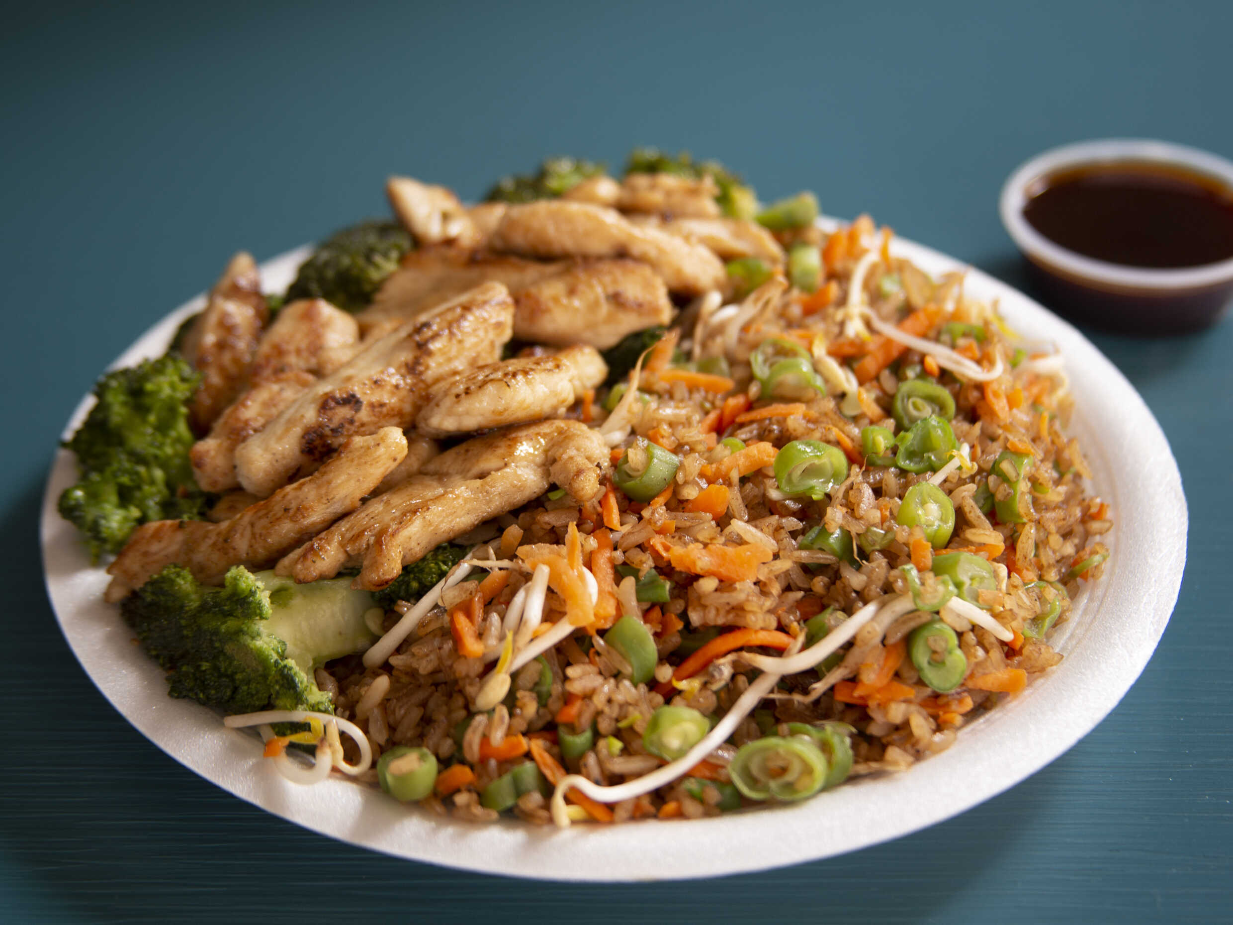 Trocitos de pechuga de pollo con brocoli, salteado en salsa de soya, con jengibre acompañado de arroz sencillo.