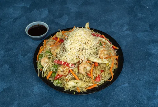 Arroz blanco salteado en salsa de curry con camarón, verduras y raíz china.