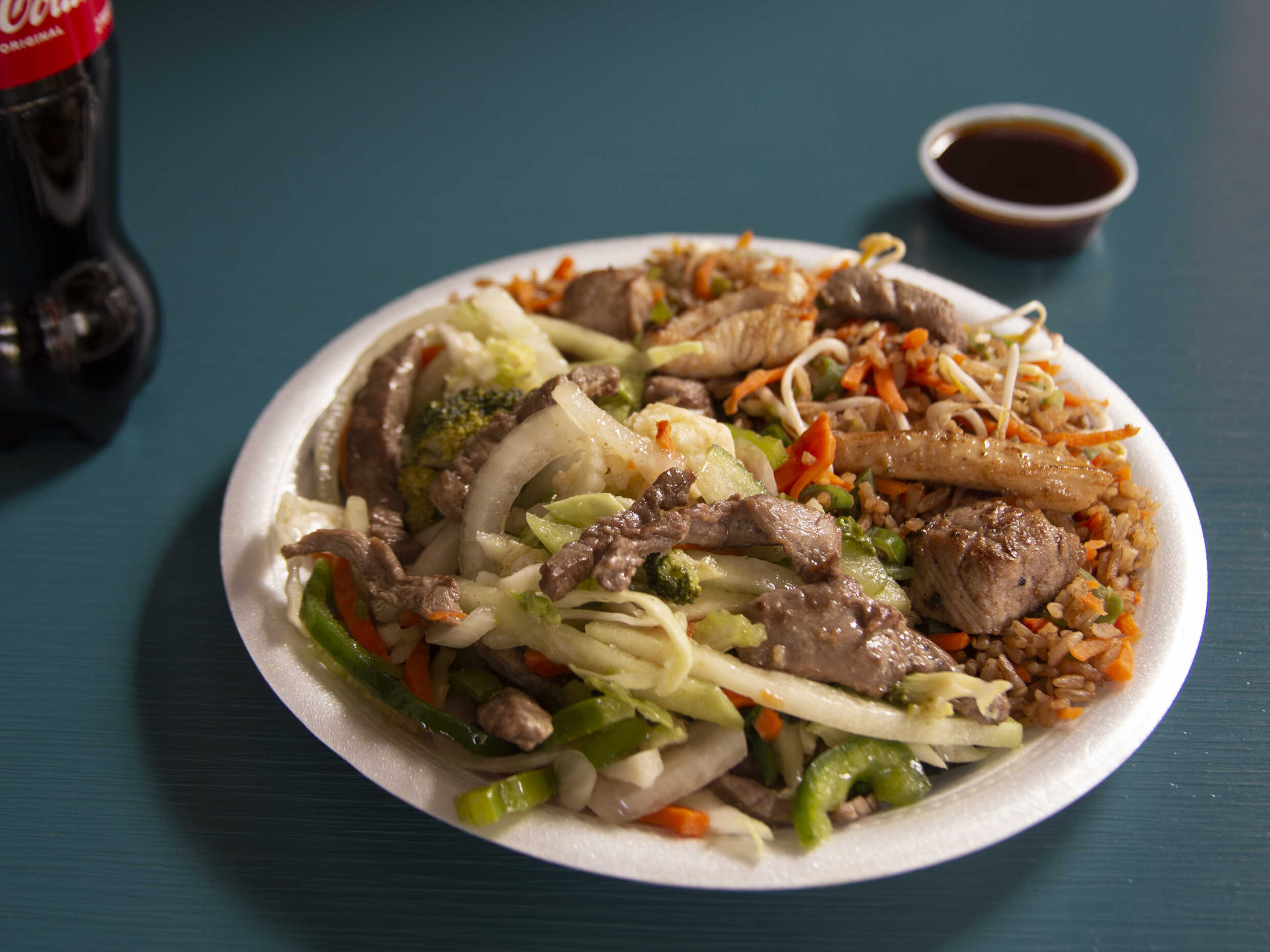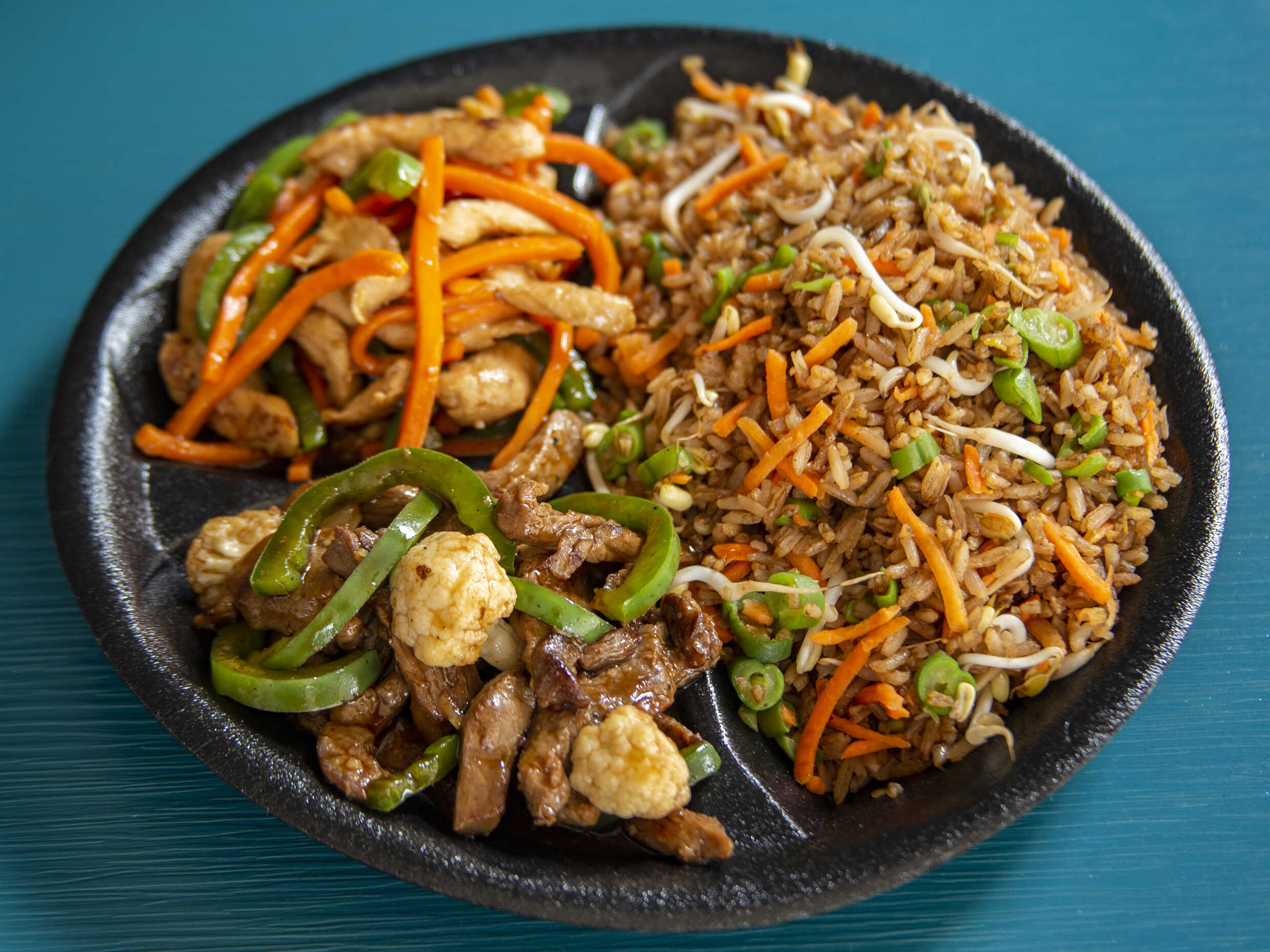 Julianas salteadas de carne en salsa teriyaki, con julianas de pollo salteadas en salsa de ostras y arroz sencillo.