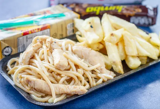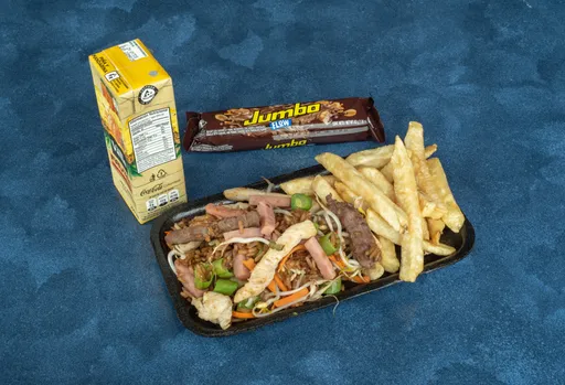 Lo mein pollo, papa a la francesa, chocolatina y jugo en caja.