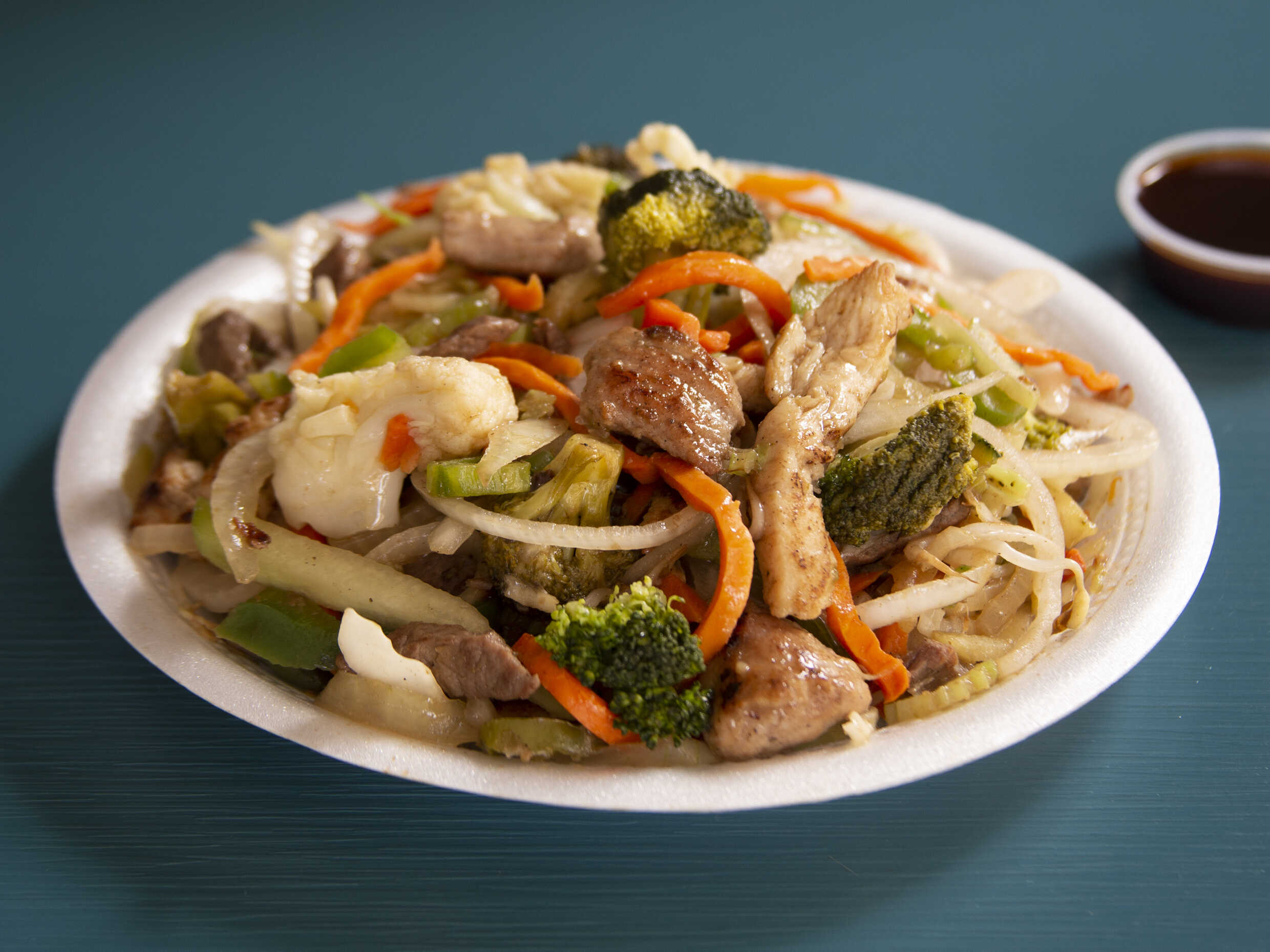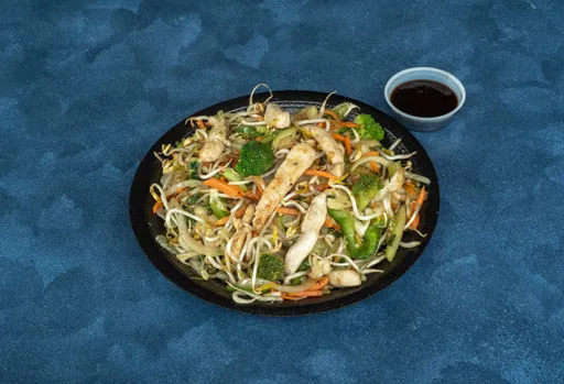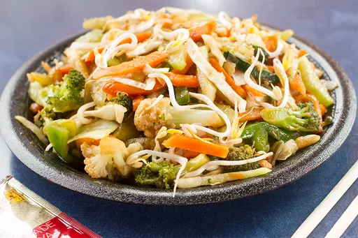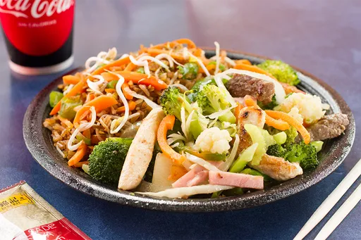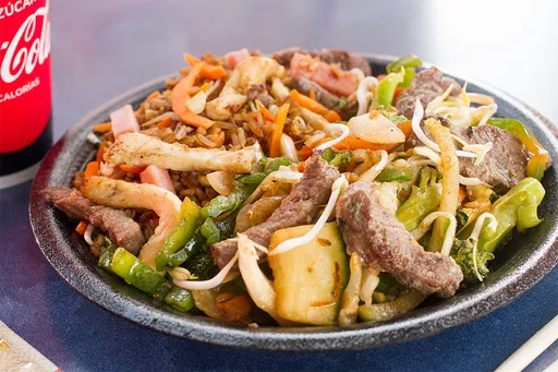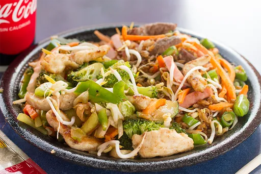 Vegatales con carne, pollo y jamón, salteados en salsa de soya.