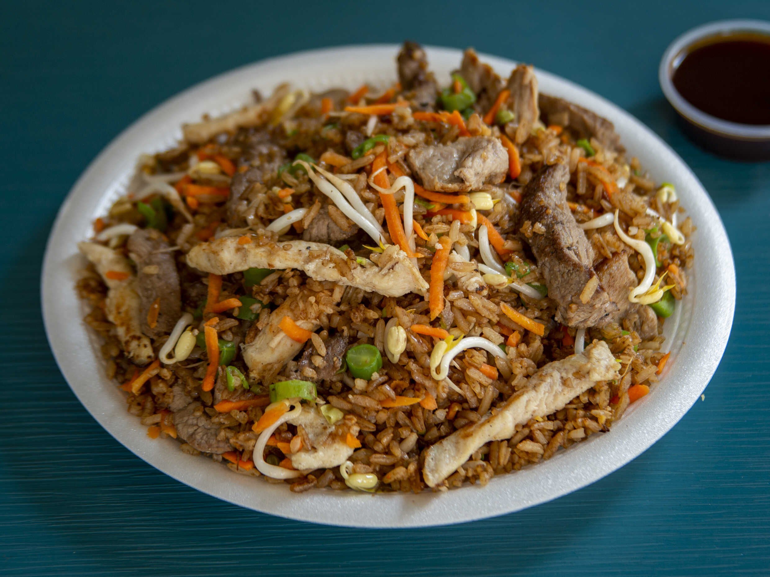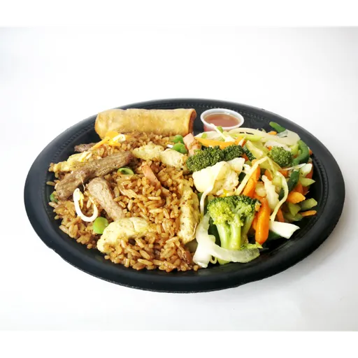 Arroz mixto con verduras, carne, pollo y cerdo.