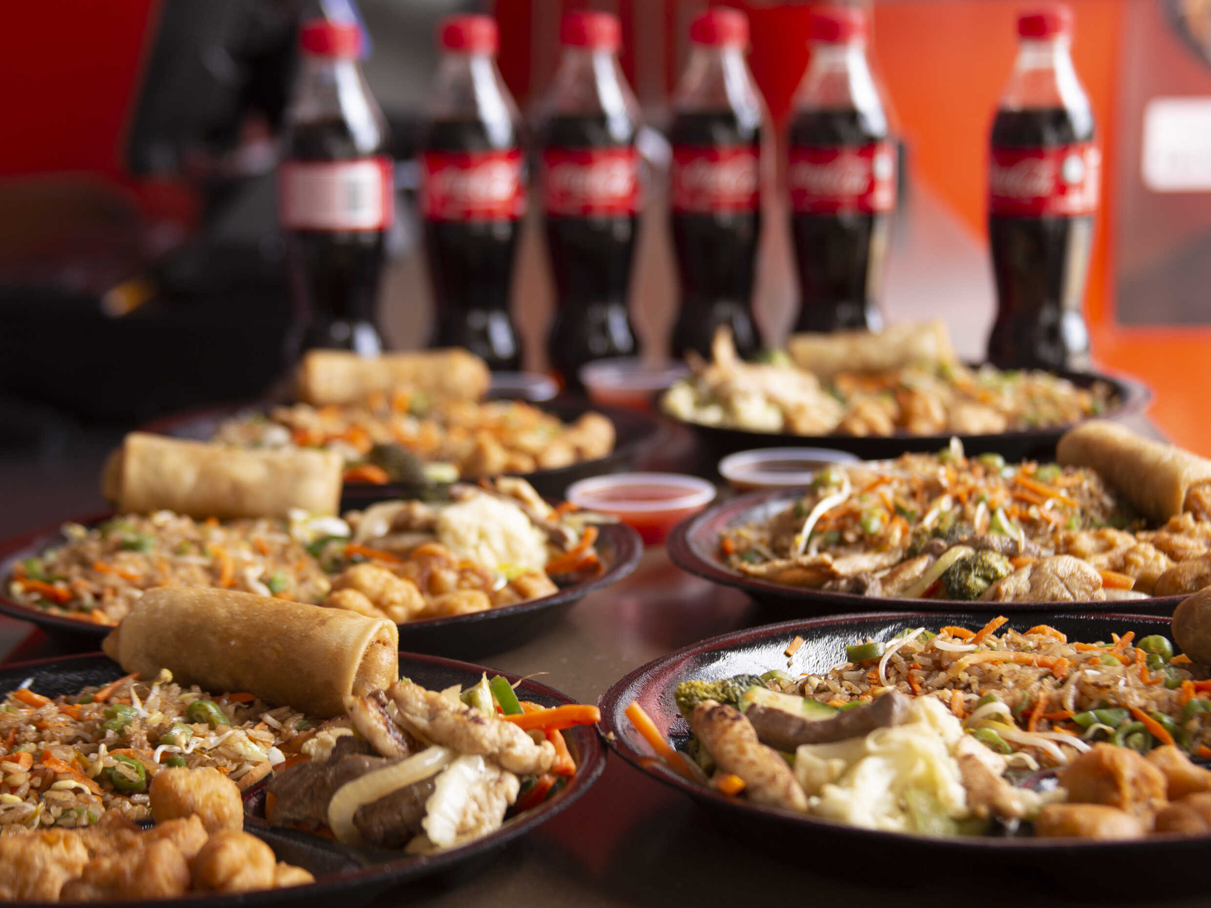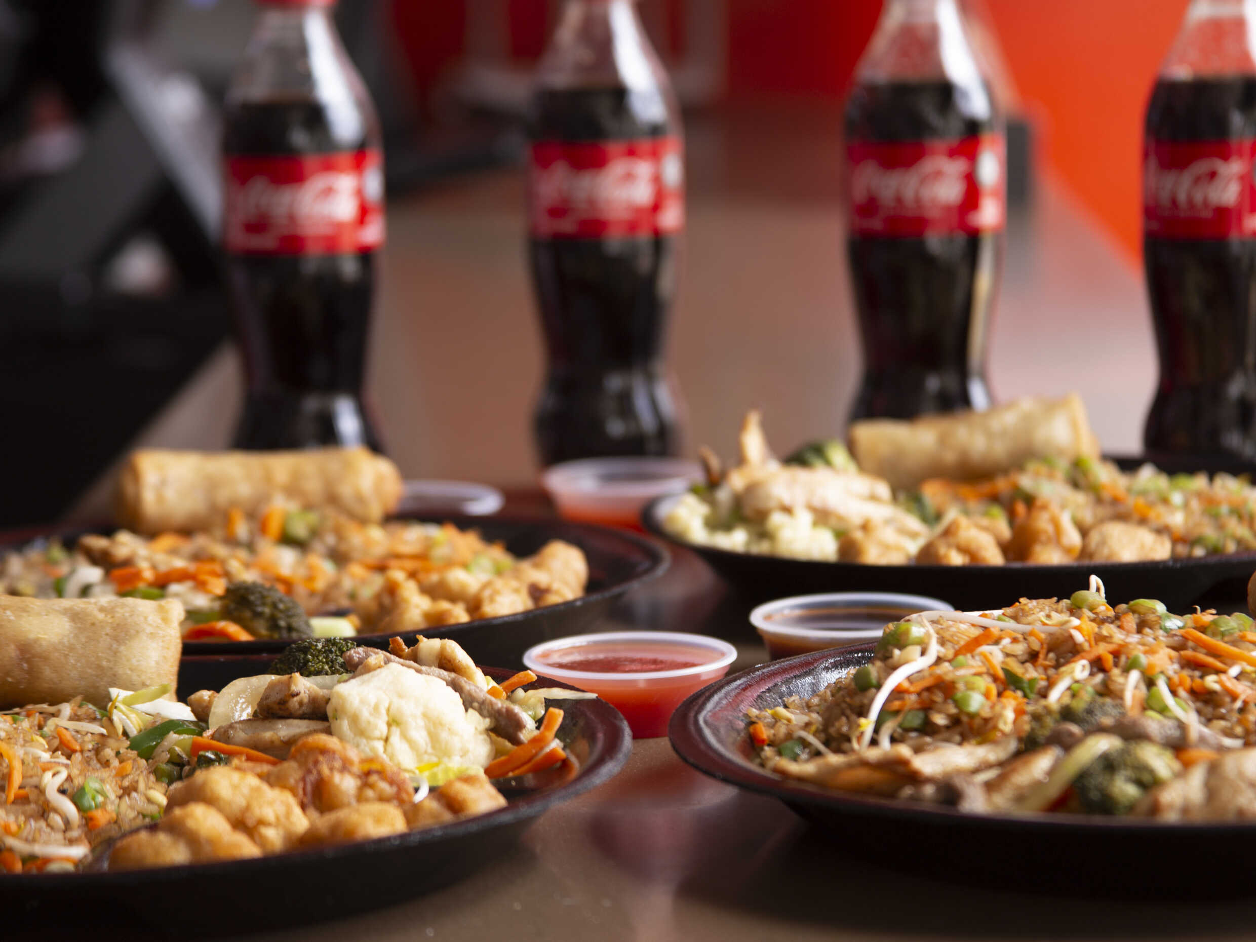110gr de pollo con salsa miel naranja, 220 gr de arroz sencillo, un egg-roll más una coca cola 250ml