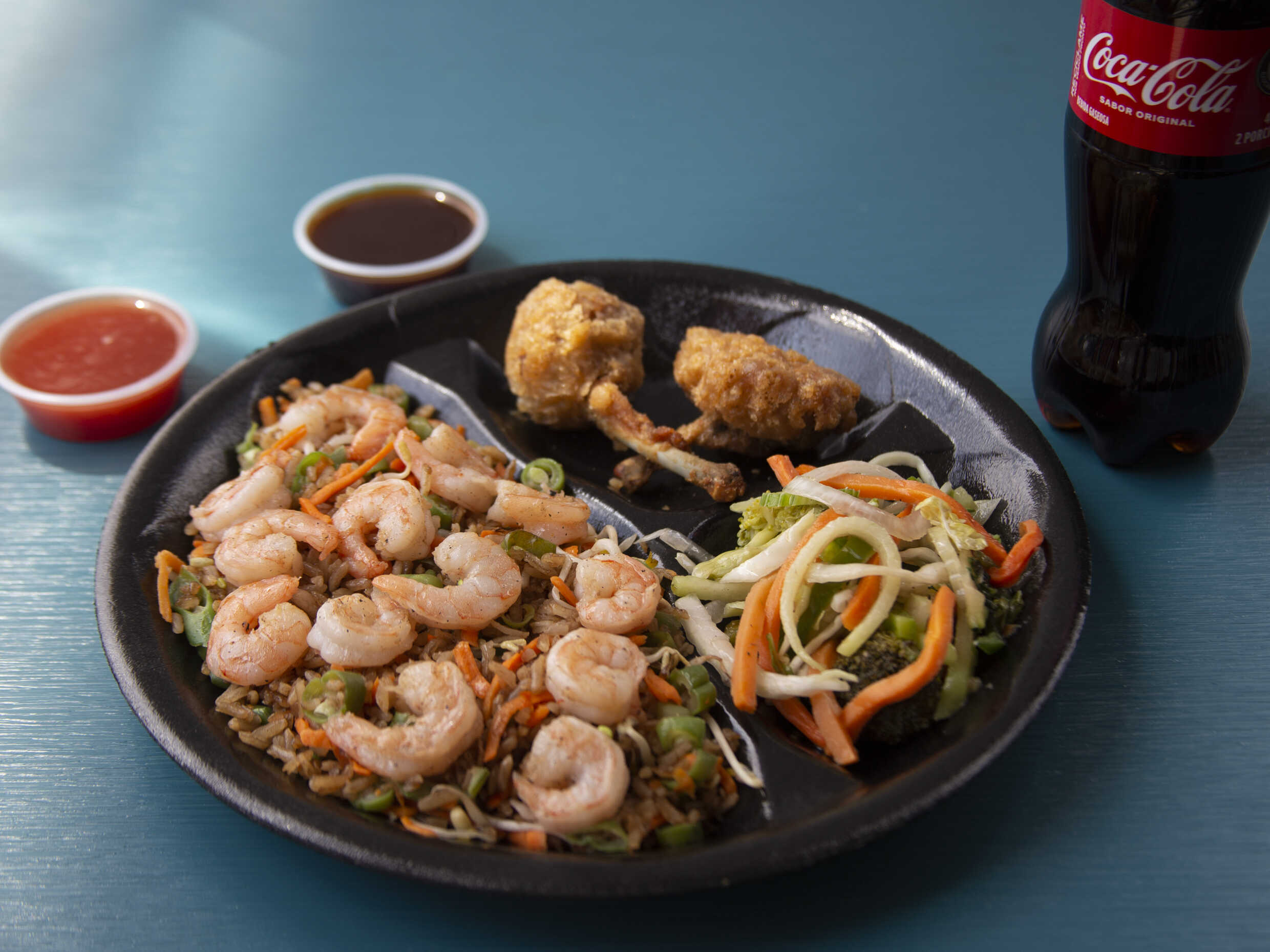 Chop suey sencillo, 2 alitas colombinas, arroz sencillo con camarón y gaseosa. 250ml