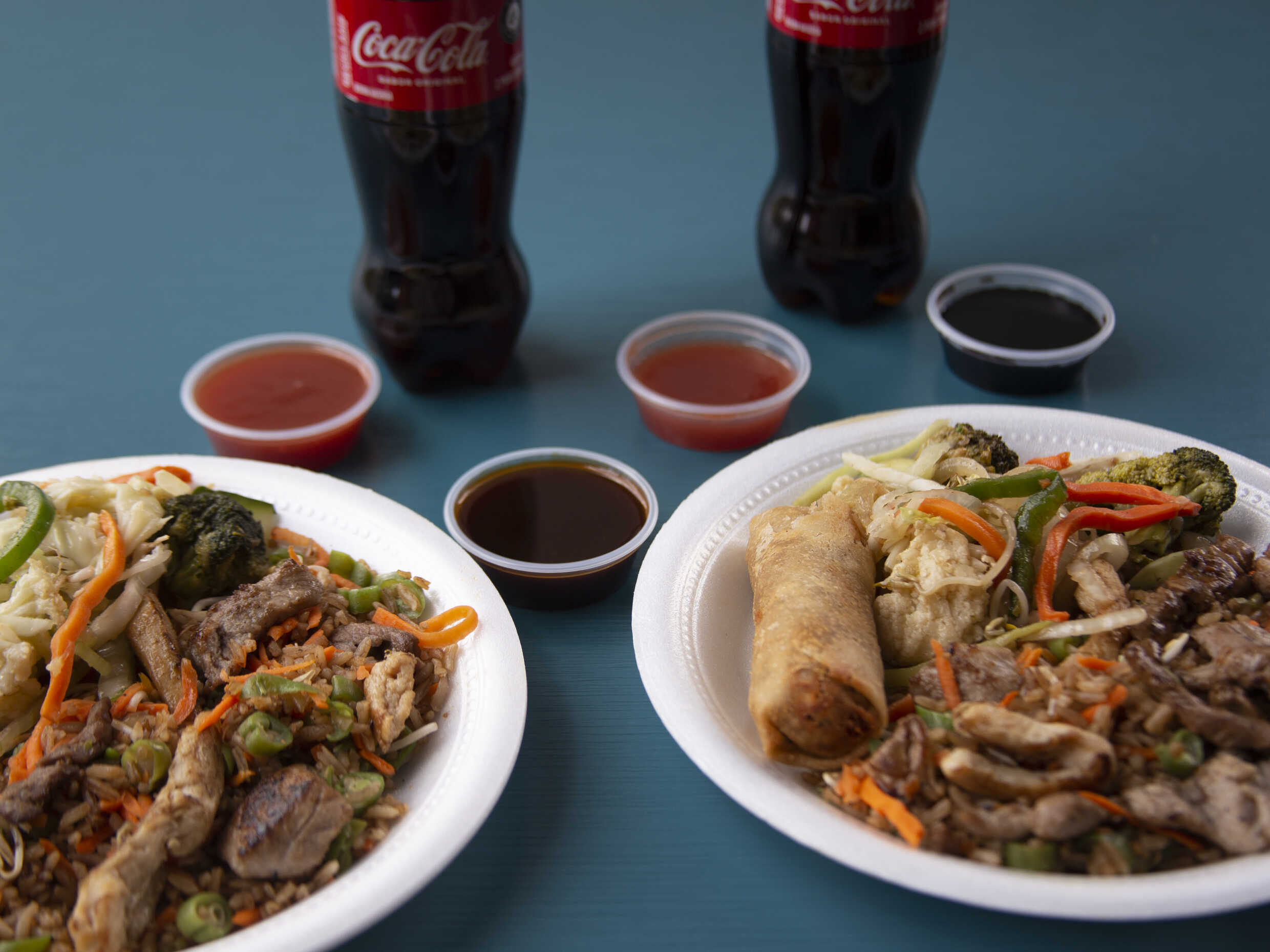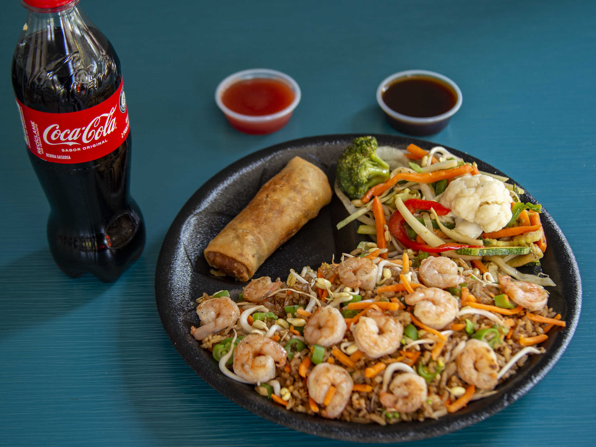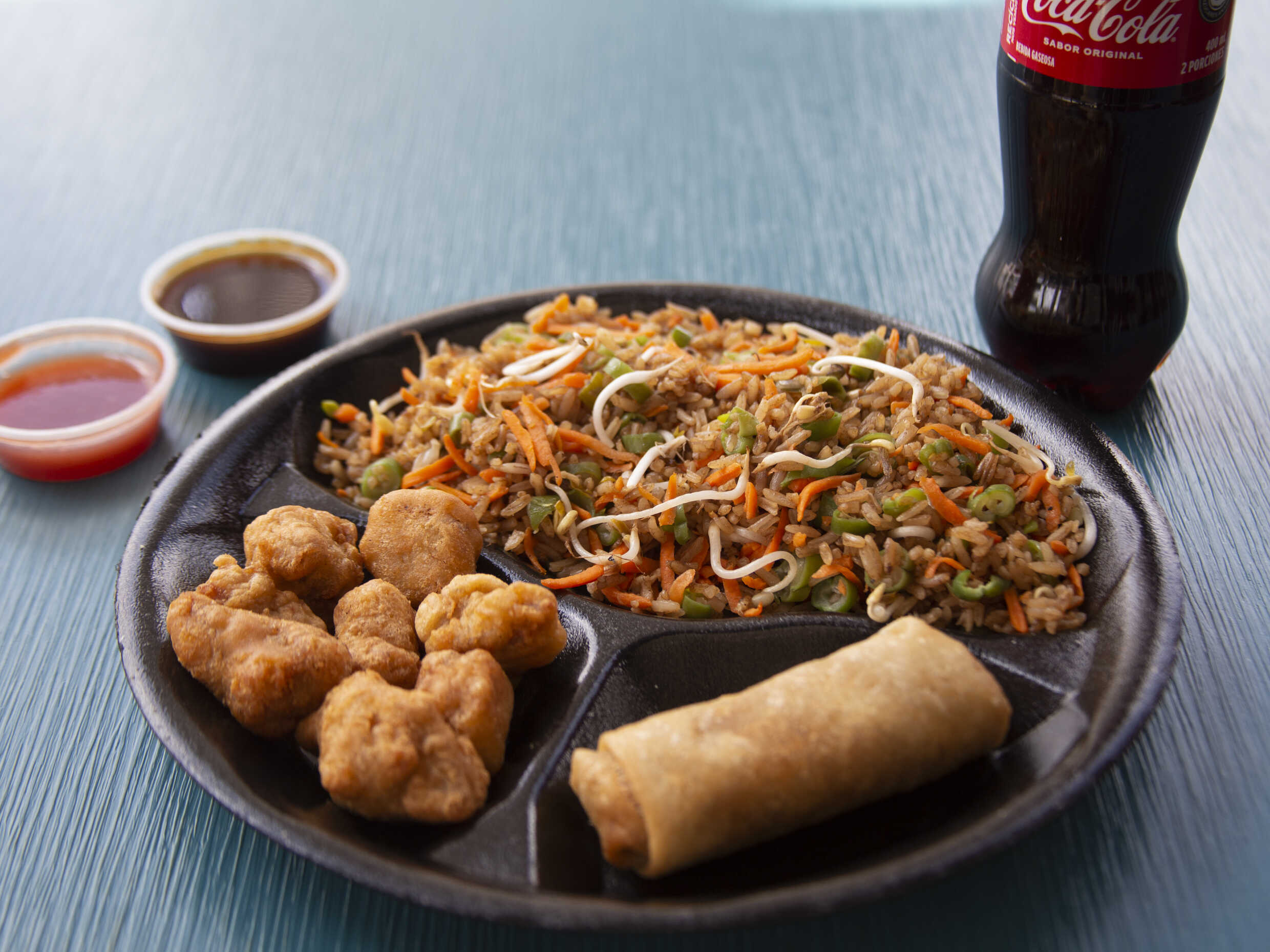 Egg roll, chop suey sencillo, arroz sencillo con camarón y gaseosa.