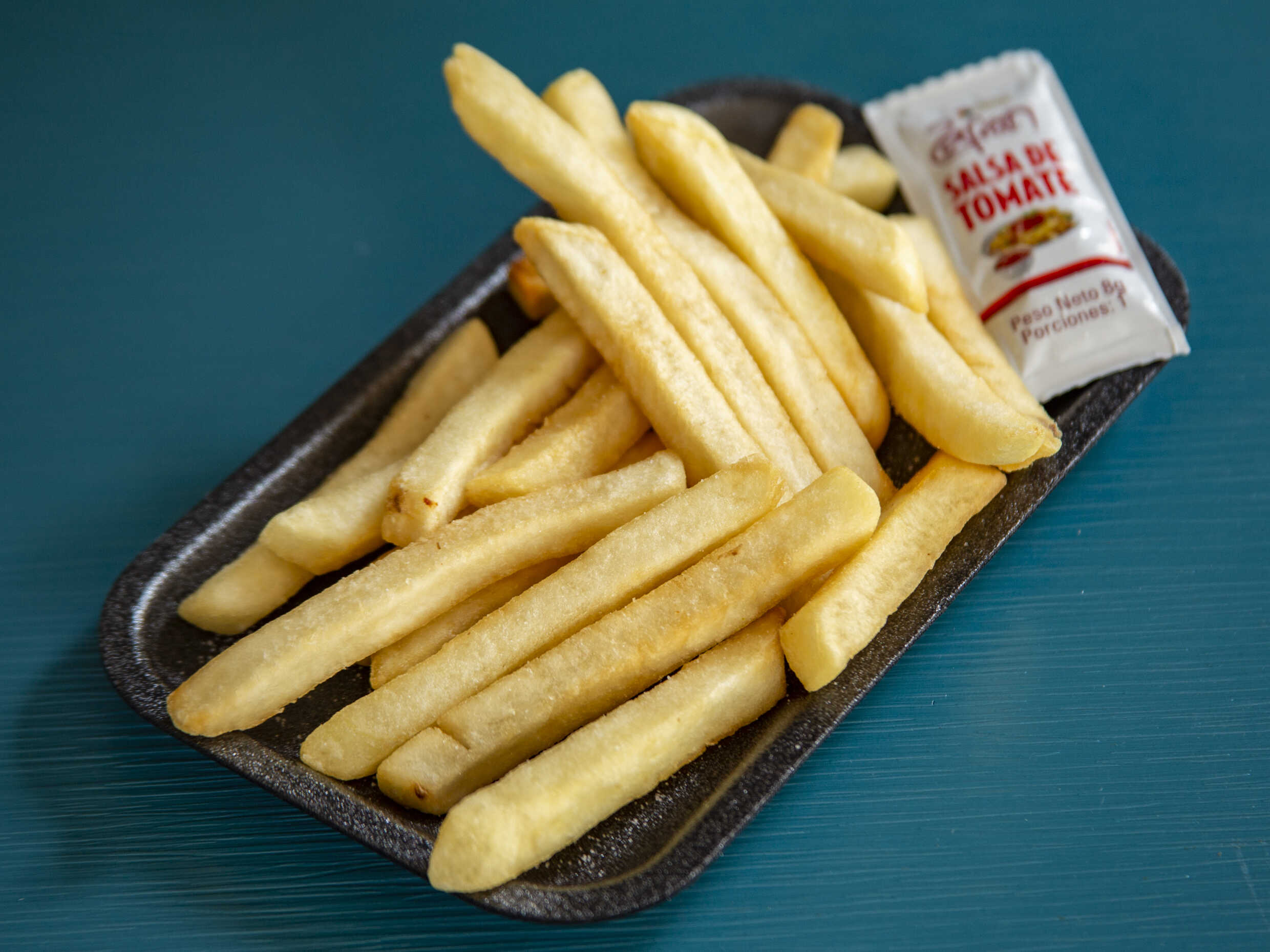 Arroz mixto, papa a la francesa, chocolatina y jugo en caja.