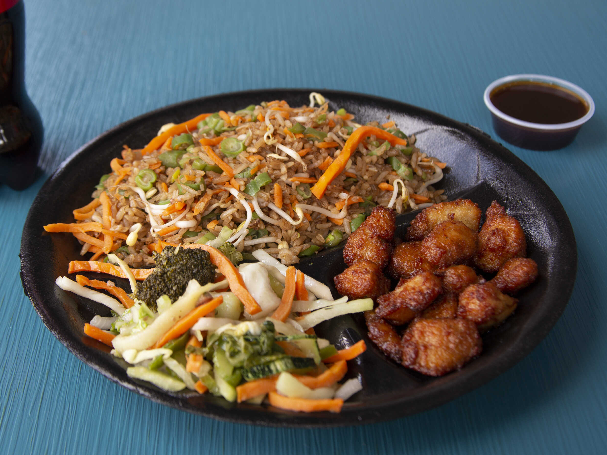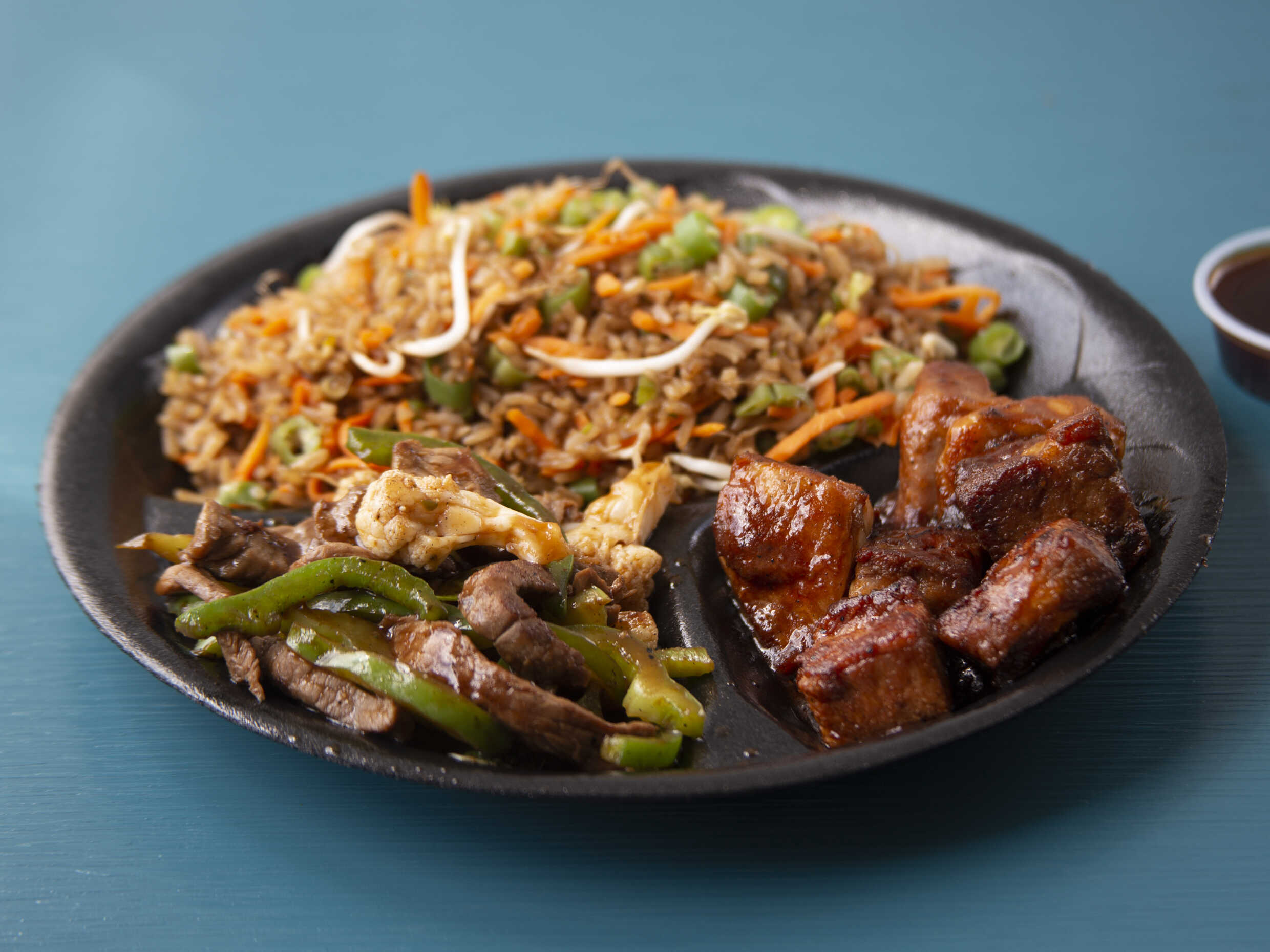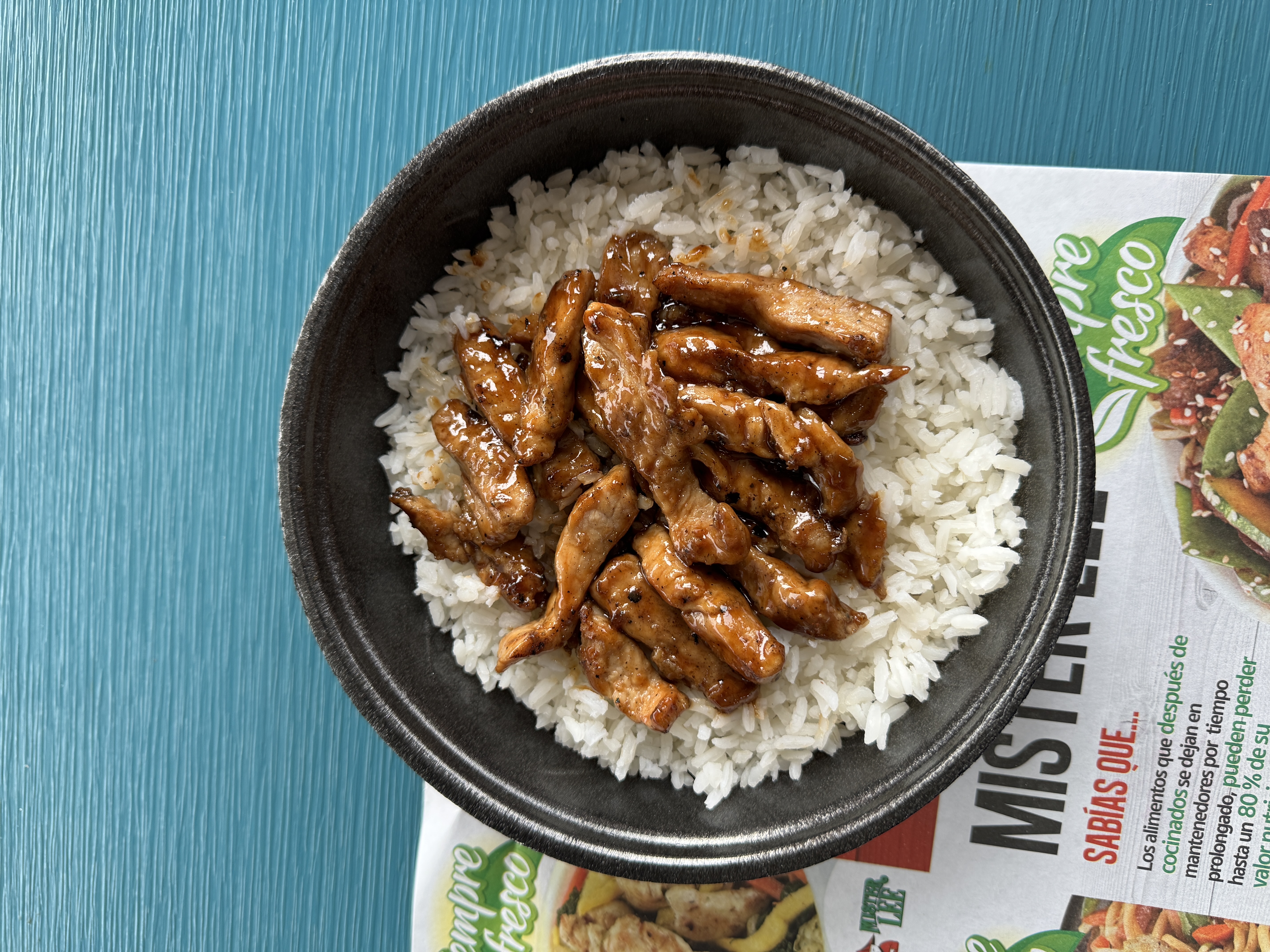 Julianas de carne salteadas en salsa teriyaki, costilla en salsa BBQ y arroz sencillo.