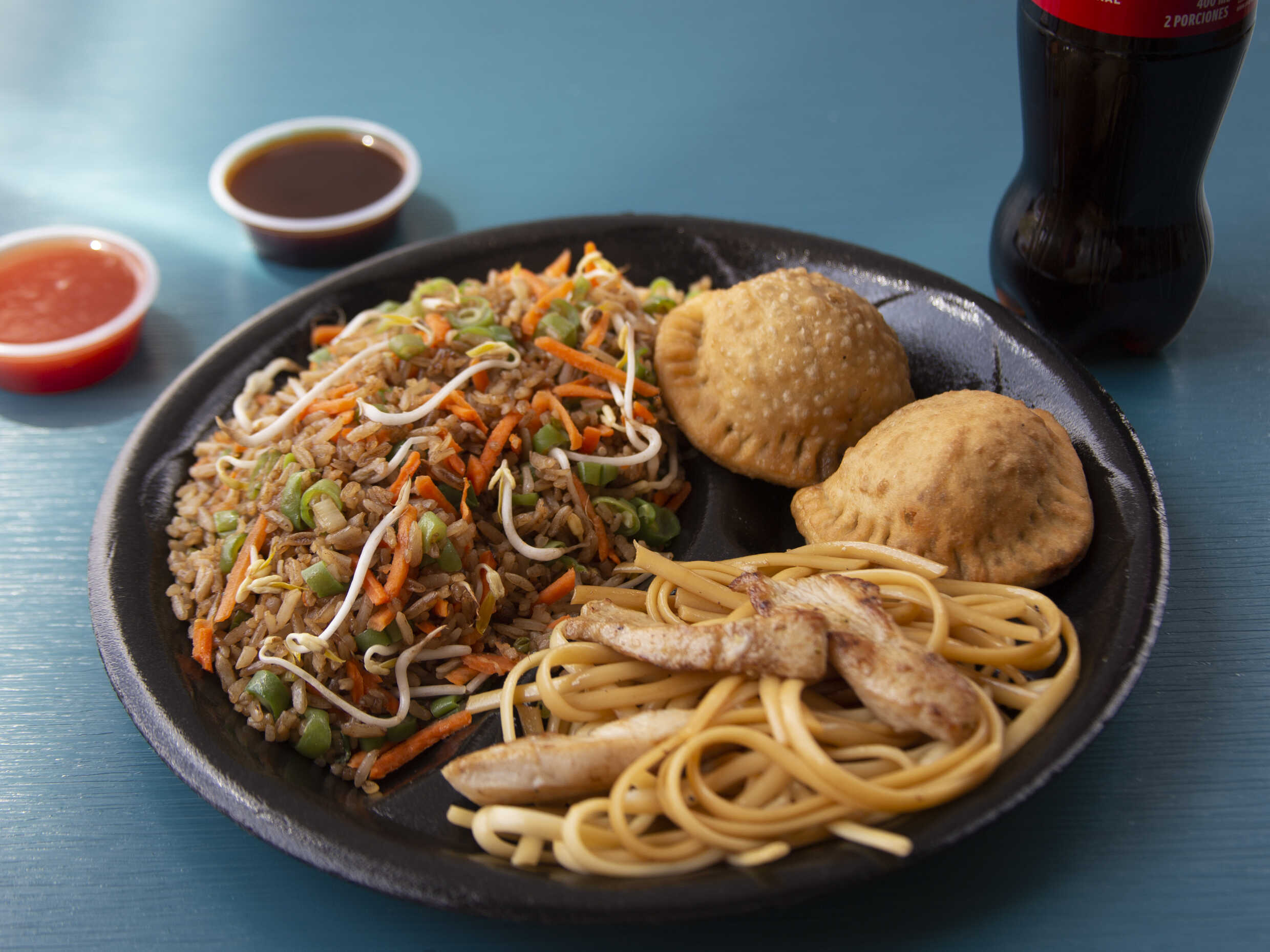 Lo mein pollo, 2 empanadas thai, arroz sencillo y gaseosa. 250ml