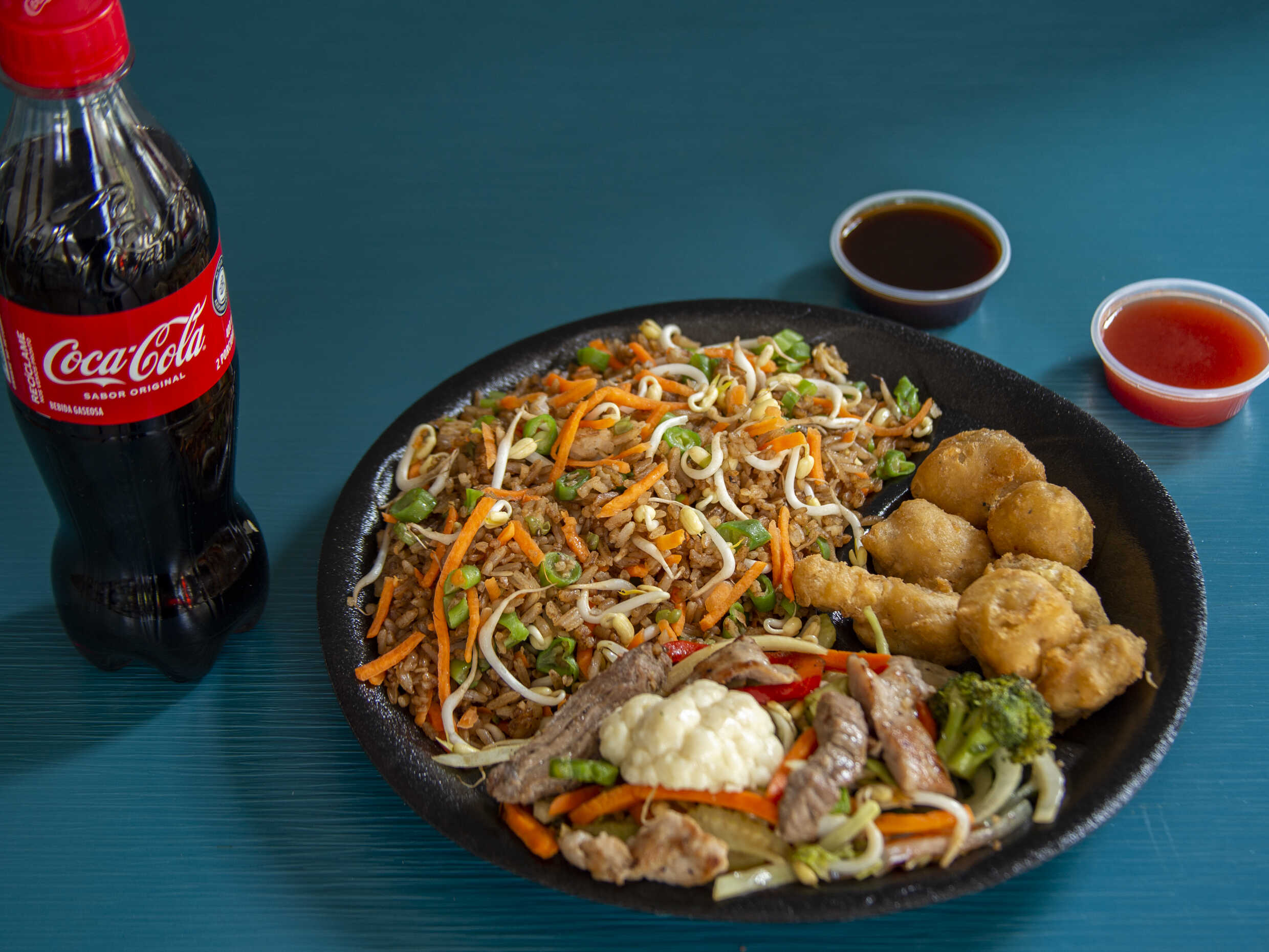 Arroz mixto con verduras, carne, pollo y cerdo, acompañado de 1 Coca Cola 250ml