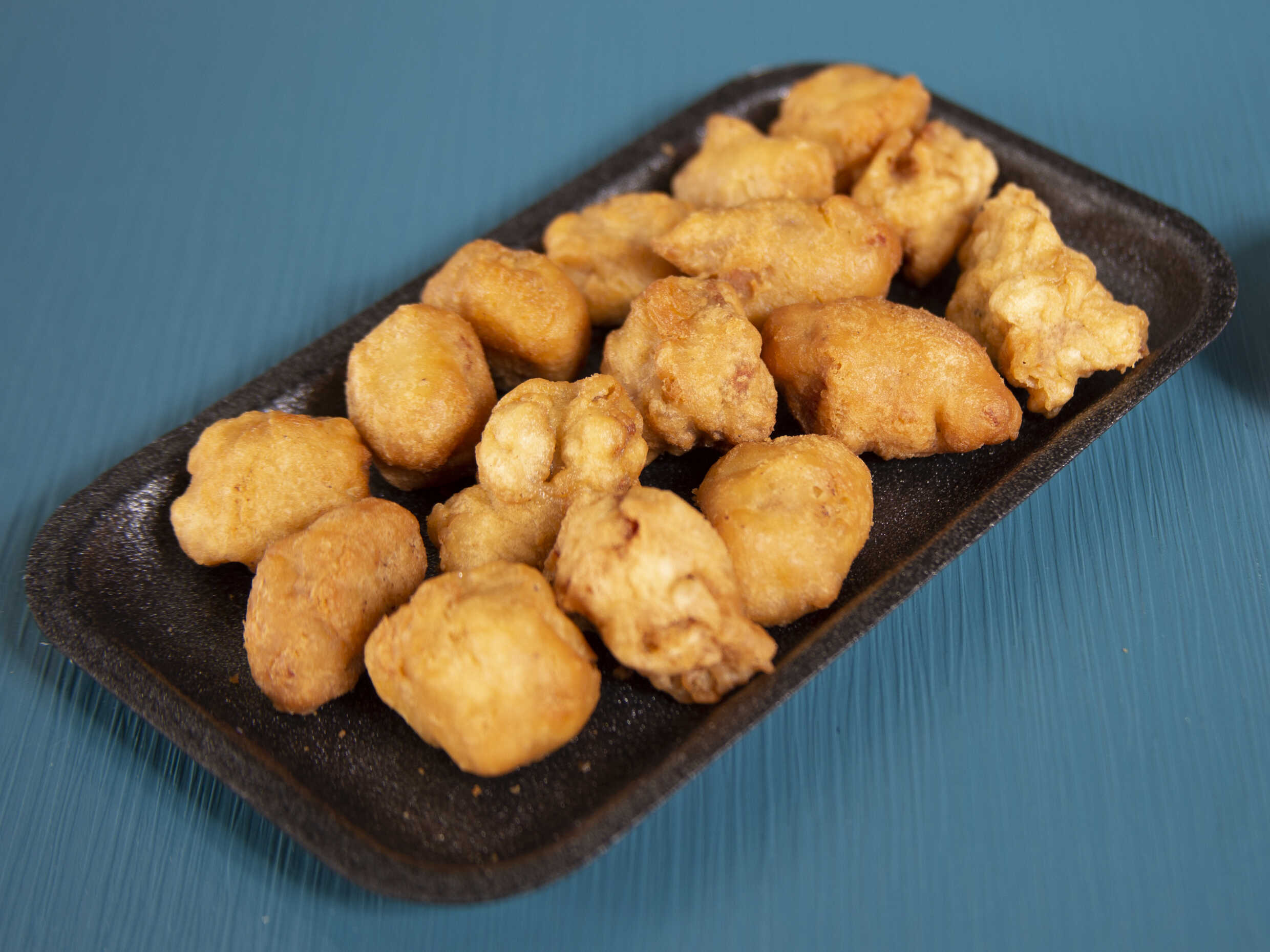 Julianas de pollo salteados en salsa de ostras, 6 cerditos apanados y arroz sencillo.
