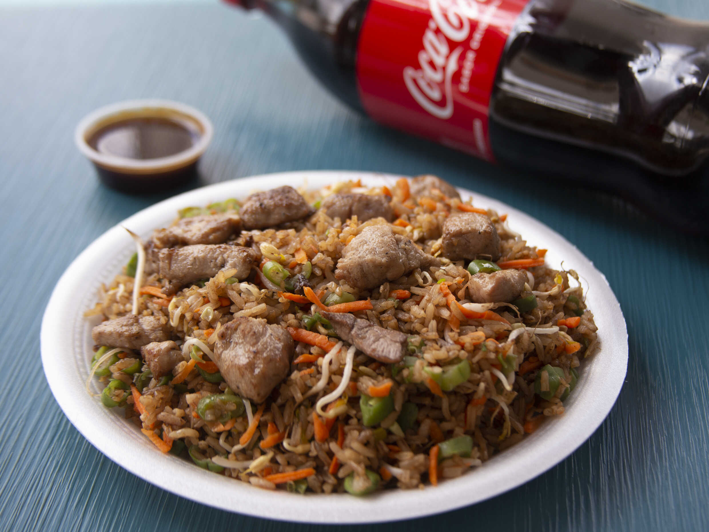 Julianas de cerdo salteadas en salada teriyaki sobre arroz frito acompañado de una coca cola pet 250ml
