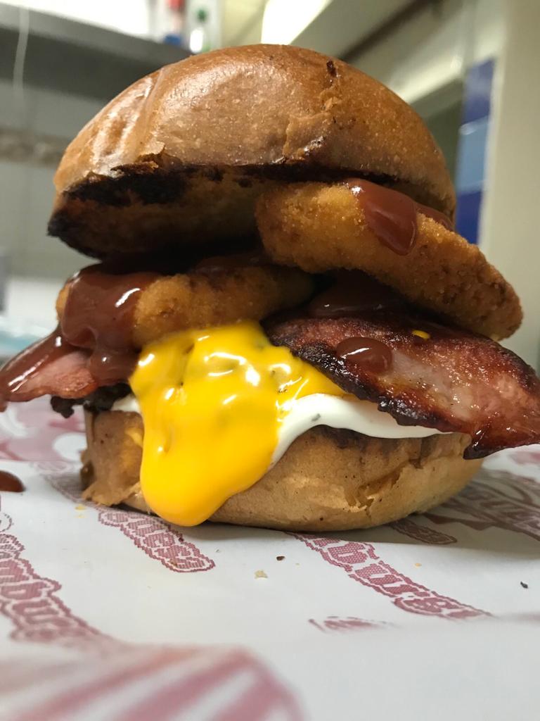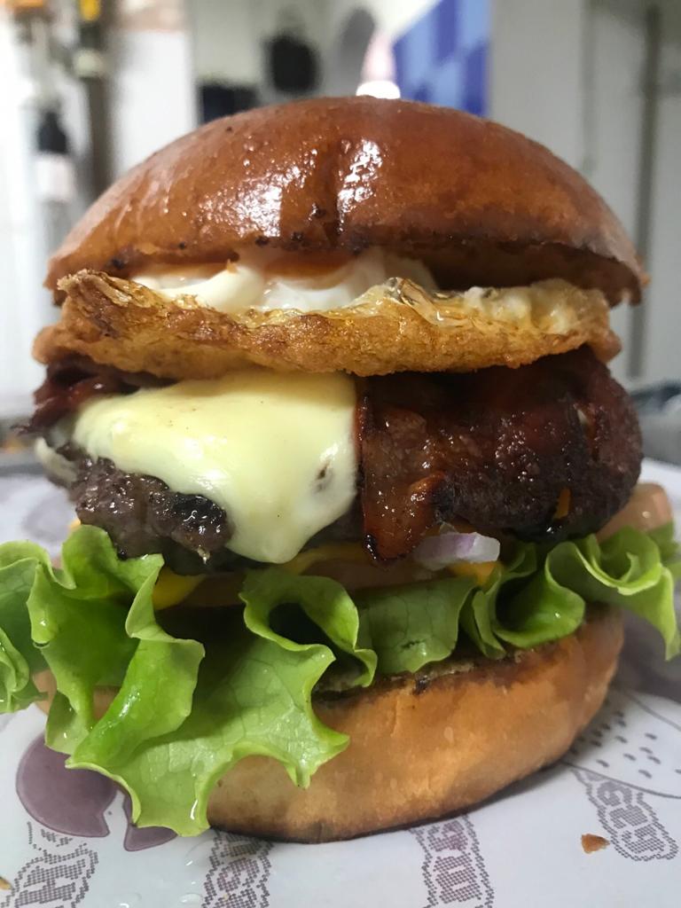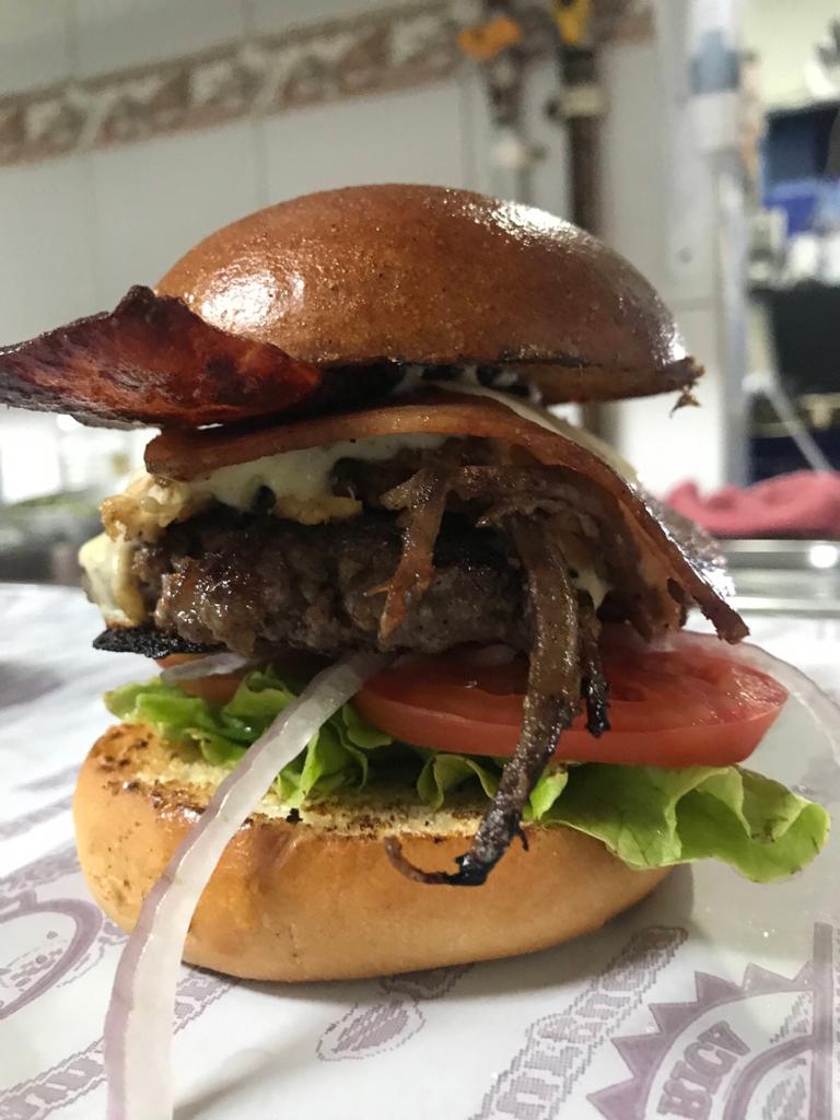 Hamburguesa 100% de res, queso mozzarella, huevo frito, doble tocineta, lechuga, tomate y cebolla.