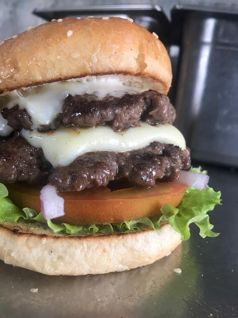 Hamburguesa doble carne 100% res, doble queso mozzarella, lechuga, tomate y cebolla.