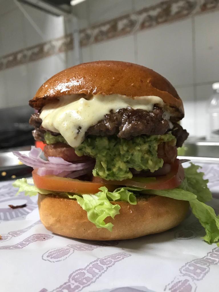 Hamburguesa 100% res, queso mozzarella, guacamole, chorizo, lechuga, tomate y cebolla.