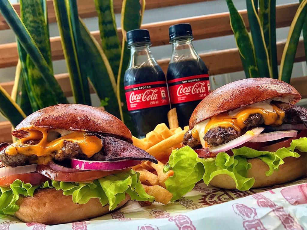 2 Hamburguesas con carne 100% res 100 g, con queso cheddar, tocineta, salsa de la casa, lechuga, tomate y cebolla, 2 porciones de papas a la francesa y 2 gaseosas 250ml